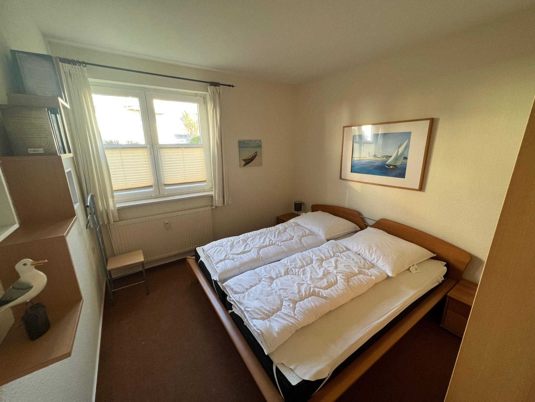 Die kleine, helle und freundliche Ferienwohnung ist ebenerdig mit Terrasse und Gartenzugang angelegt. Sie verfügt über einen Wohnbereich mit integrierter Küchenzeile, einem Schlafzimmer mit Doppelbett und einem Badezimmer mit Dusche und WC. Das Auto parken Sie ganz bequem in der Tiefgarage. Der Stellplatz ist identisch mit der Wohnungsnummer. Schwimmbad (täglich geöffnet) und Sauna (dienstags, freitags und samstags geöffnet) stehen ebenfalls zur Verfügung. Wäschepakete können jederzeit zugebucht werden. 20,00 Euro pro Person. Sie können auch gern Ihre eigene Bettwäsche und Handtücher mitbringen.