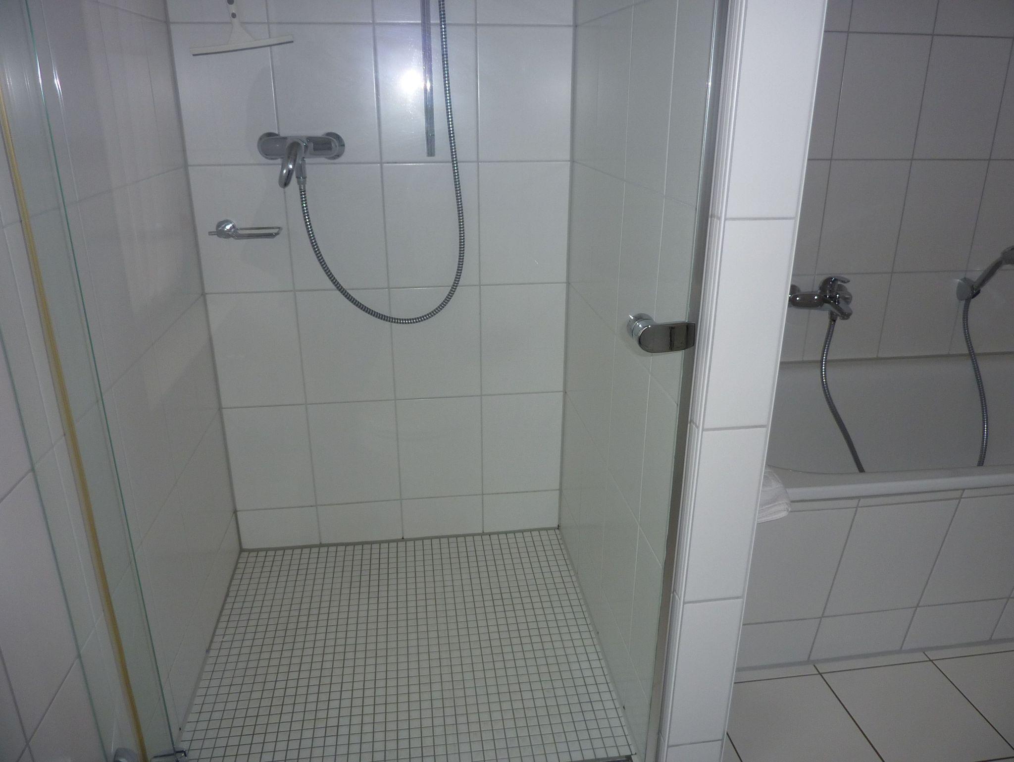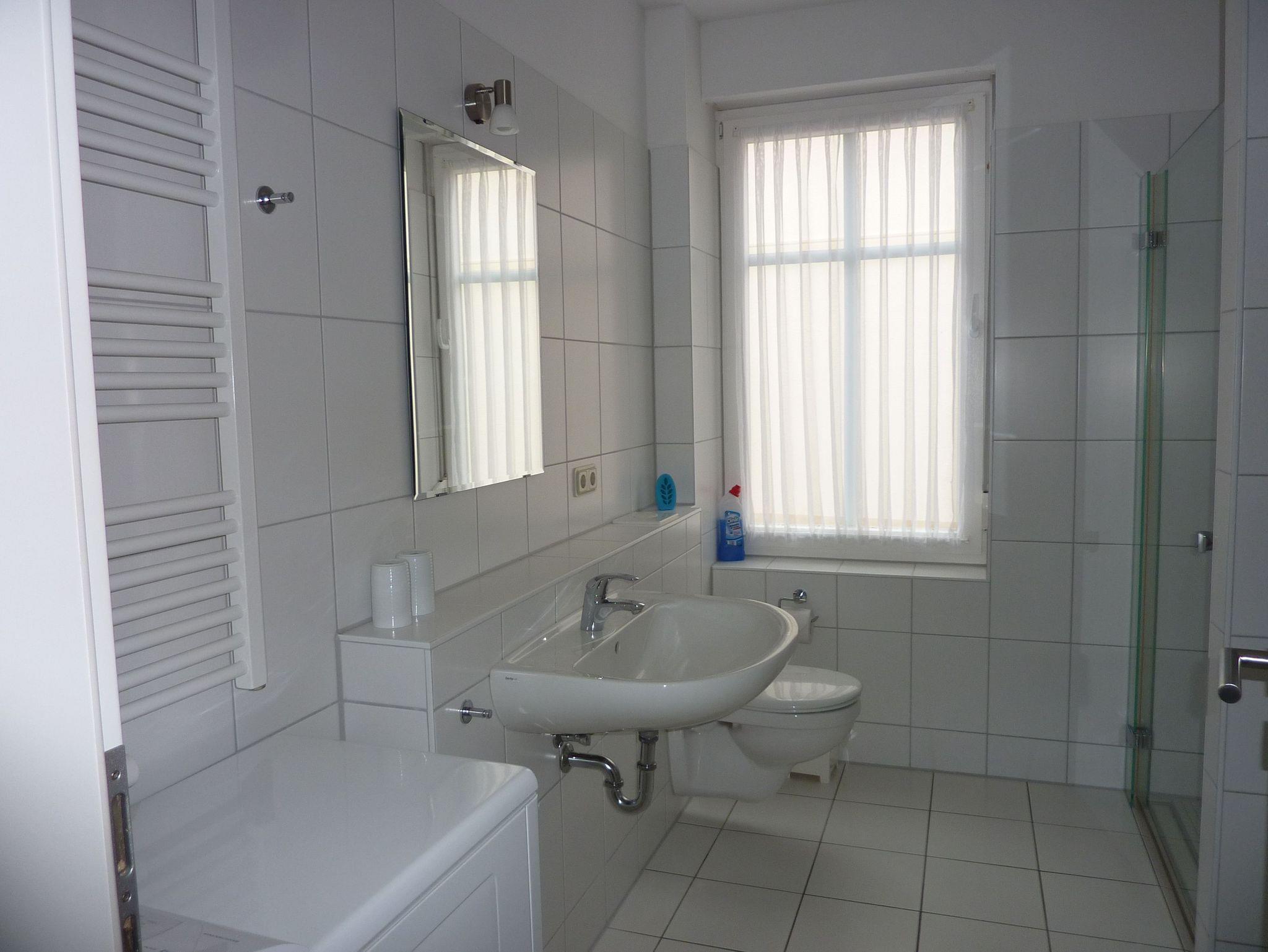 Das Bad ist mit Dusche und einer Wanne ausgestattet. Ihre Wäsche können Sie mit einer Waschmaschine waschen. Die Maschine ist steht platzsparend neben der Tür im Badezimmer. Mittels eines Hebels lassen sich Räder ausfahren, so dass die Maschine leicht vor dem Waschbecken in Arbeitsposition gefahren werden kann. Bei der Maschine handelt es sich um einen kombinierten Wasch-Trocken-Automaten.