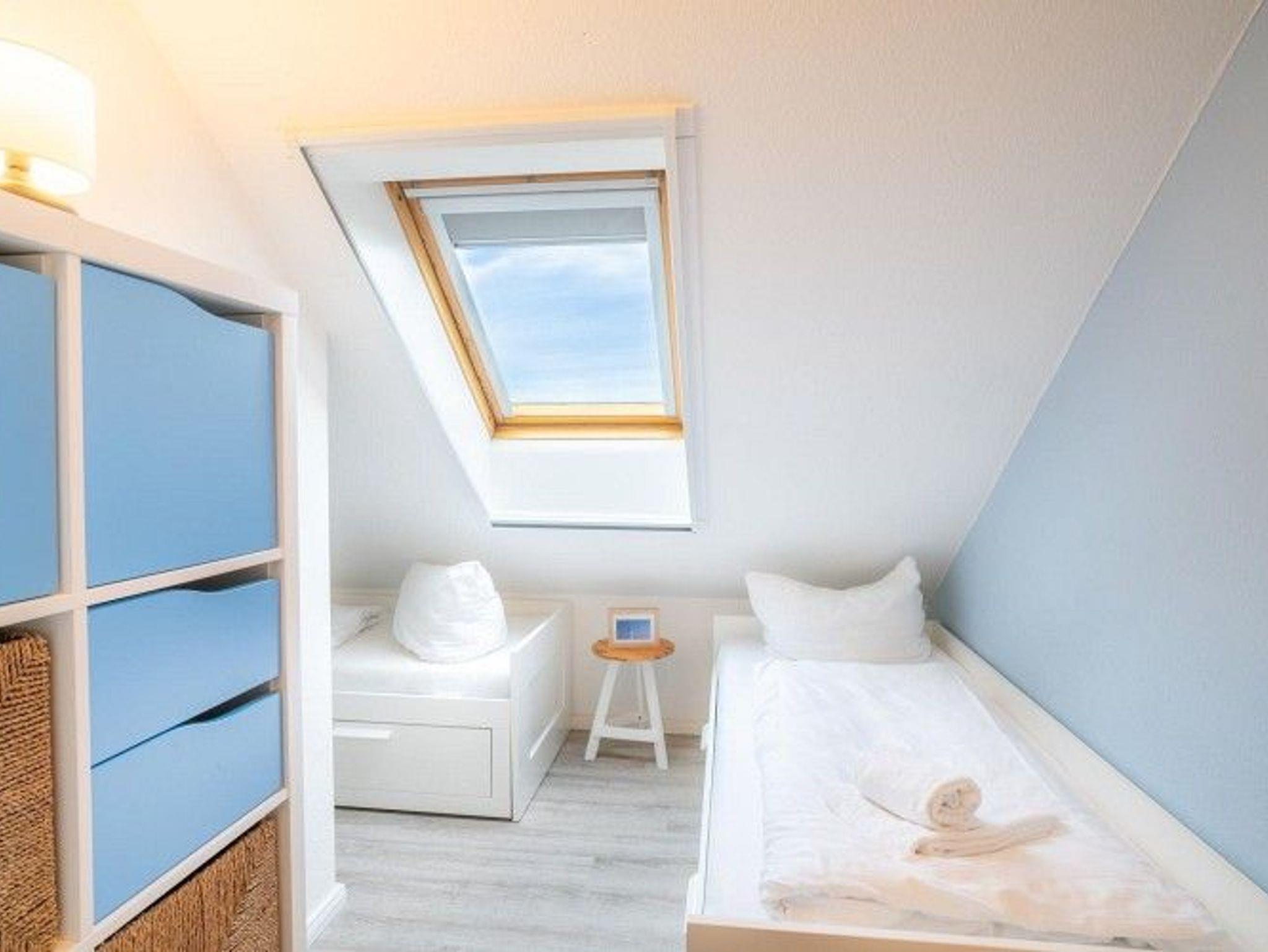 Ferienwohnung über zwei Ebenen. Im unteren Bereich befindet sich das Wohnzimmer mit Austritt auf den Balkon, Sitzecke und Einbauküche sowie Badezimmer mit Dusche und WC. Die Dusche verfügt über einen niedrigen Einstieg. Ein Föhn ist vorhanden. Die Schlafzimmer erreichen Sie eine Treppe hoch.