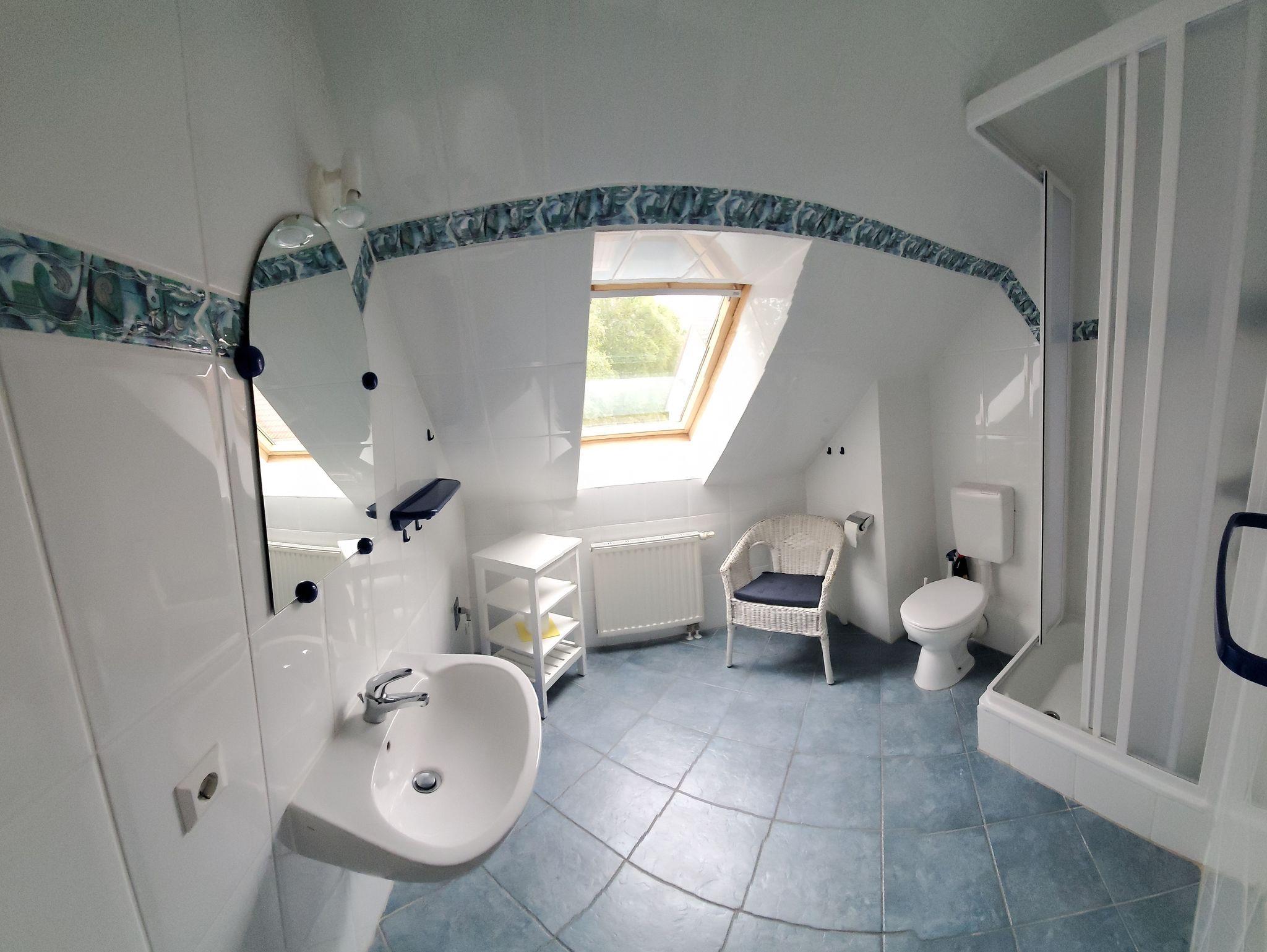 Ebenfalls im Obergeschoss befindet sich das Badezimmer mit Dusche, WC.
