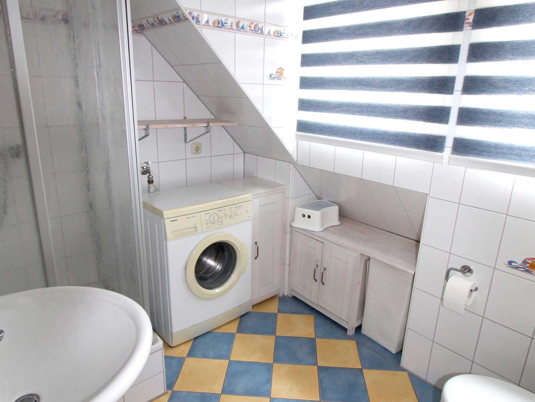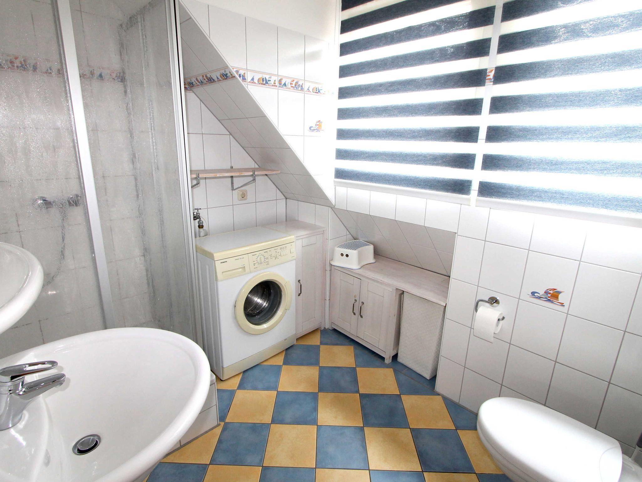 Das Badezimmer verfügt über eine Dusche, WC sowie eine Waschmaschine.