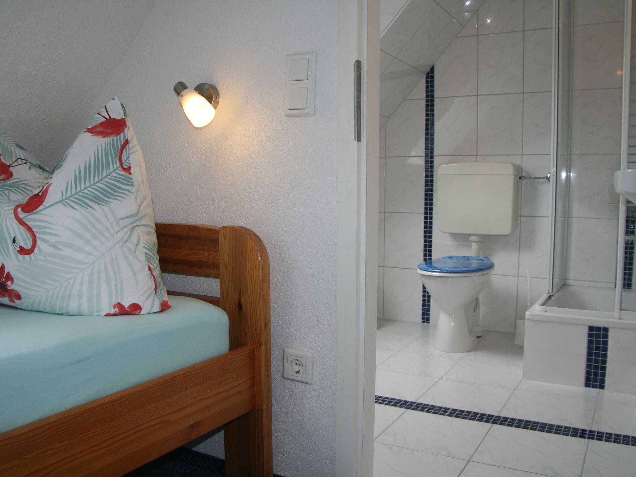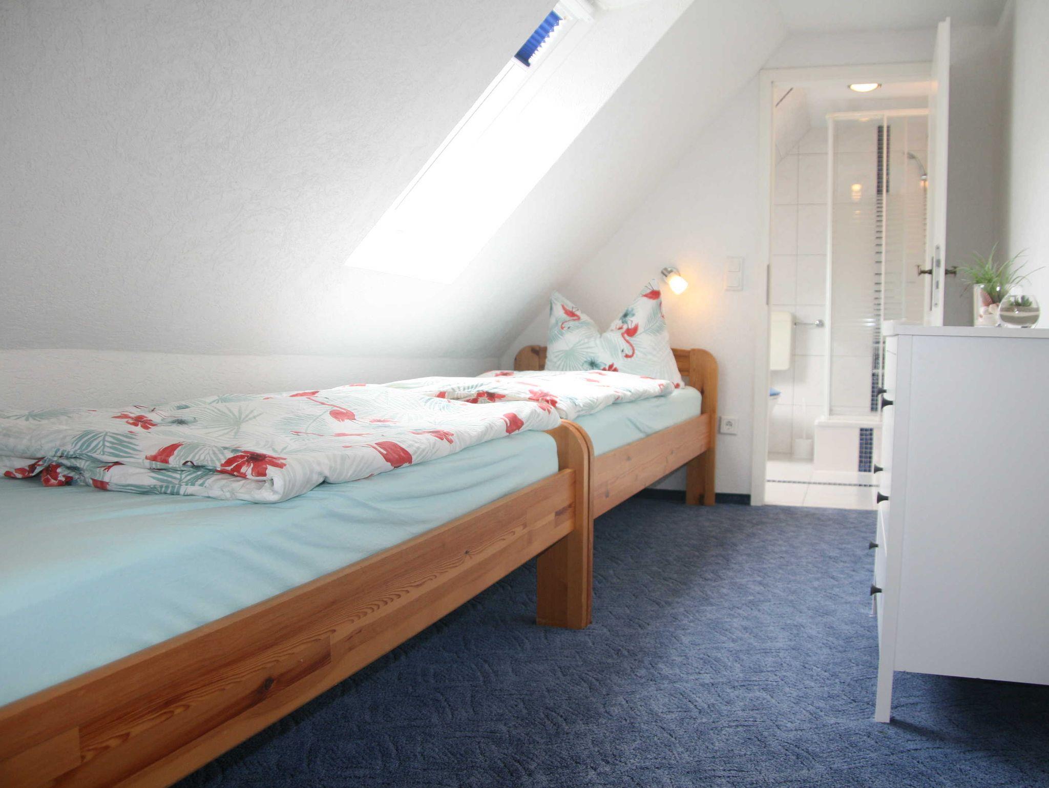 Moderne Ferienwohnung im Obergeschoss eines Doppelhauses mit Garten. Der Gastgeber wohnt im Erdgeschoss. Gäste und Gastgeber haben jeweils für sich eine separate Gartensitzecke zum Relaxen, Grillen und Sonnen sowie einen PKW-Stellplatz auf 1000m² großem gemeinschaftlichen Grundstück.