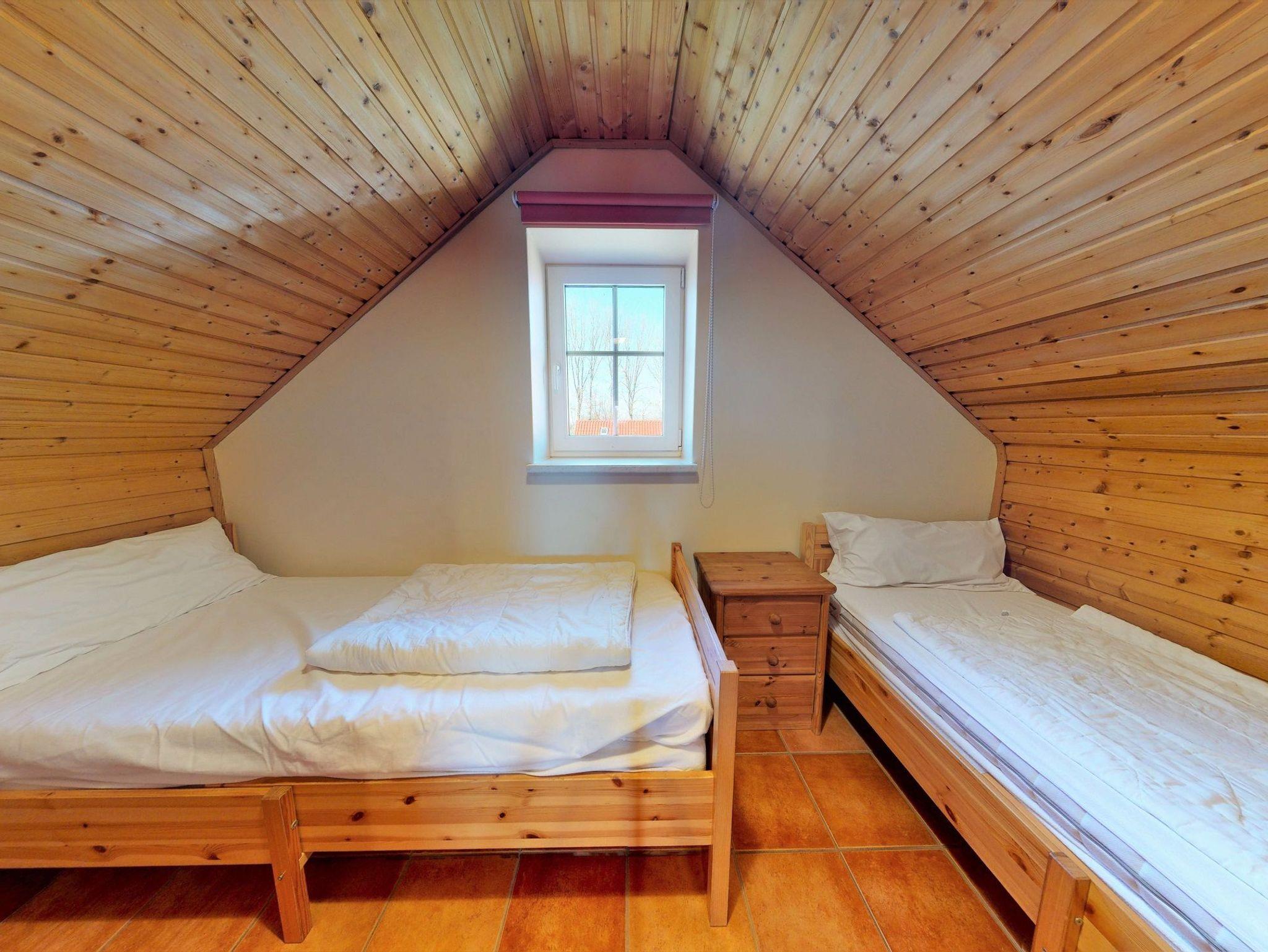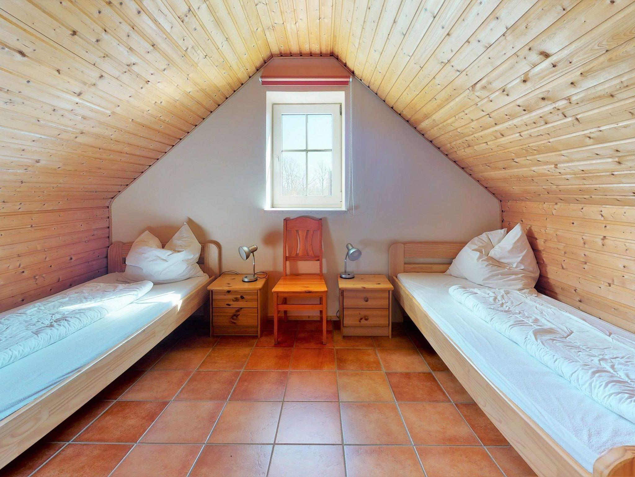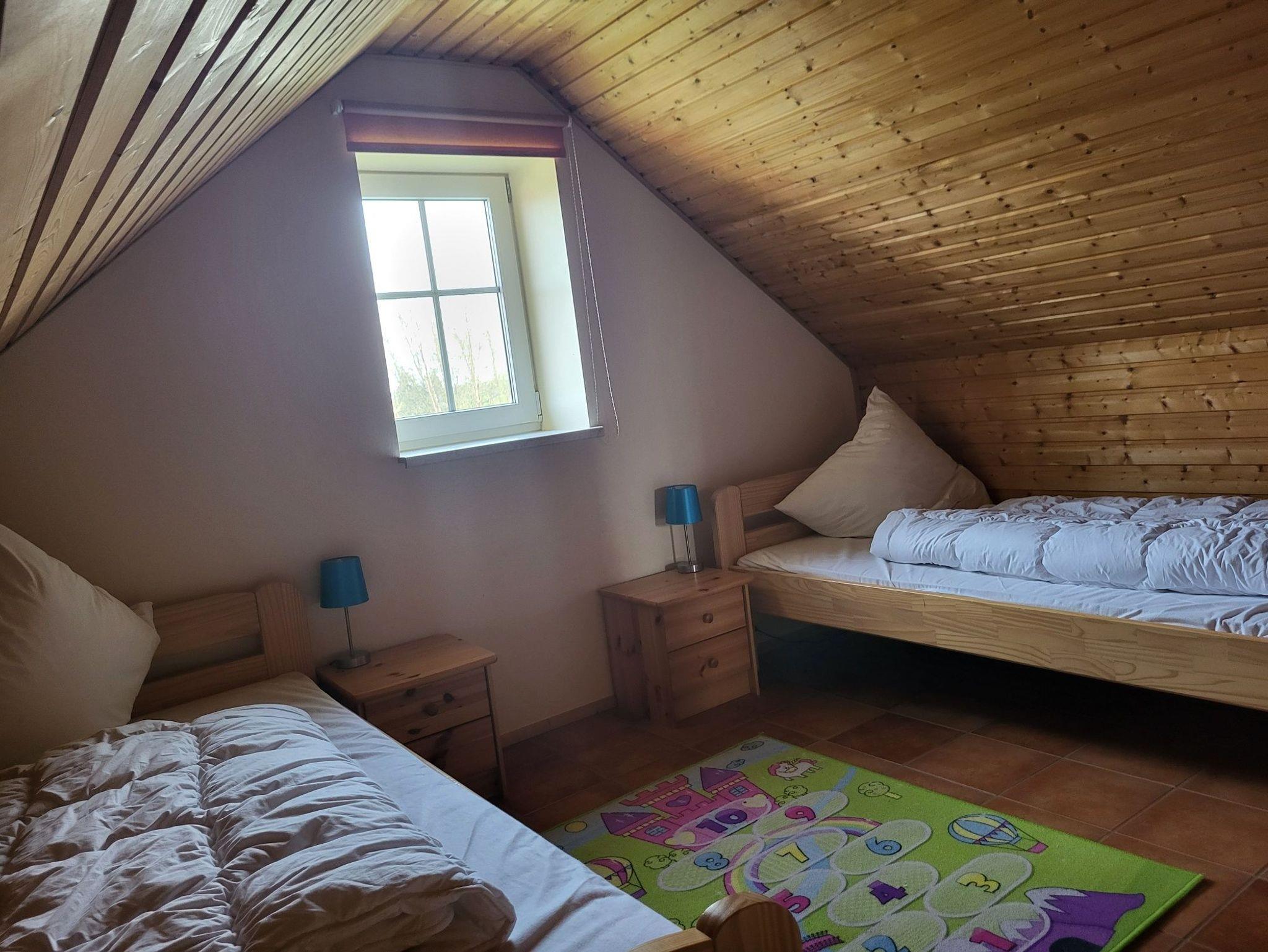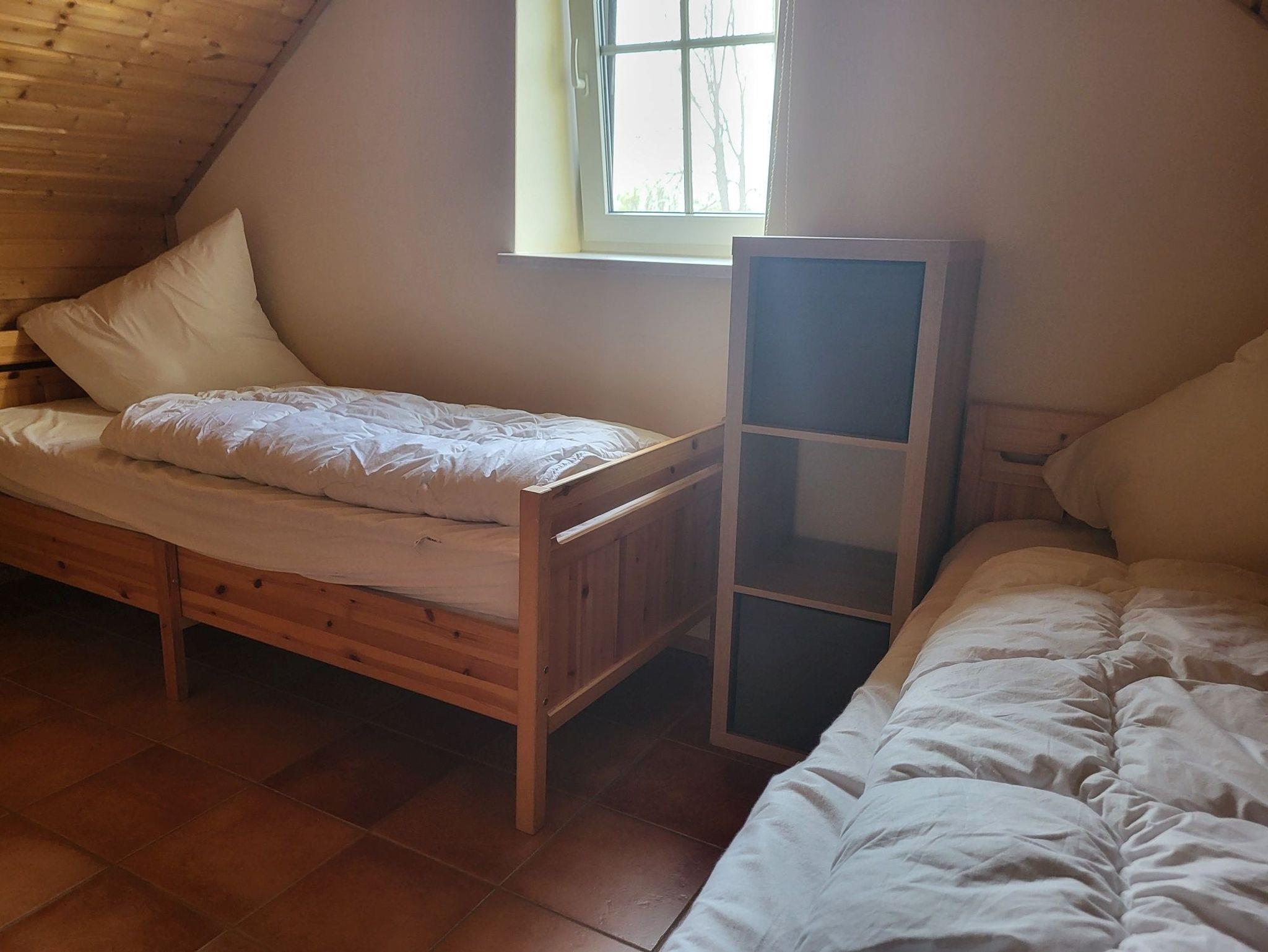 Im Obergeschoss unter den Dachschrägen befinden sich zwei weitere Schlafzimmer. Schlafzimmer 2 ist mit 2 Einzelbetten (je 0,90 m) ausgestattet, die wahlweise zusammen oder getrennt gestellt werden können. In Schlafzimmer 3 stehen 2 Einzelbetten (je 0,80 m) zur Verfügung. Zudem gibt es ein Gäste-WC mit Waschbecken.