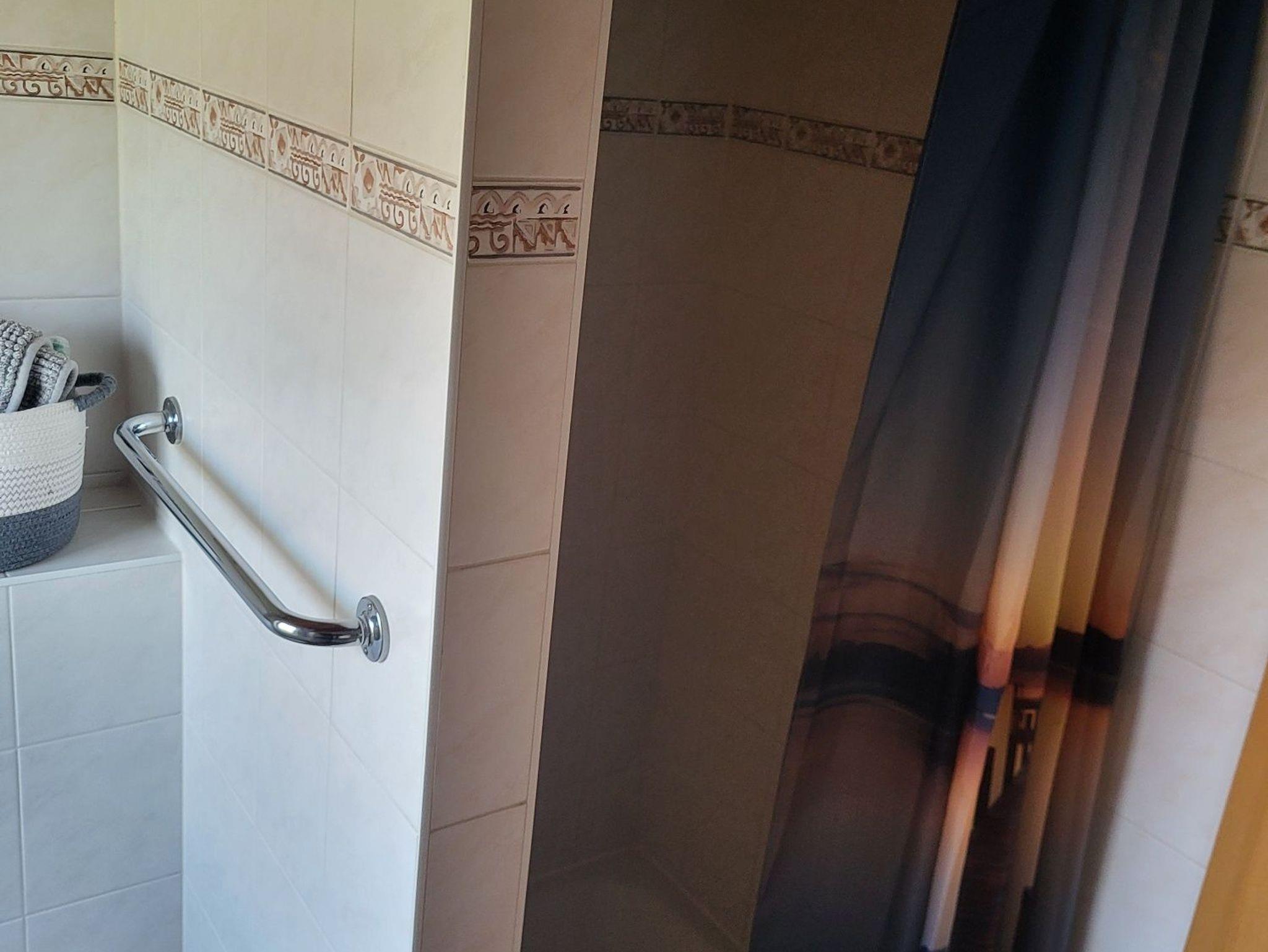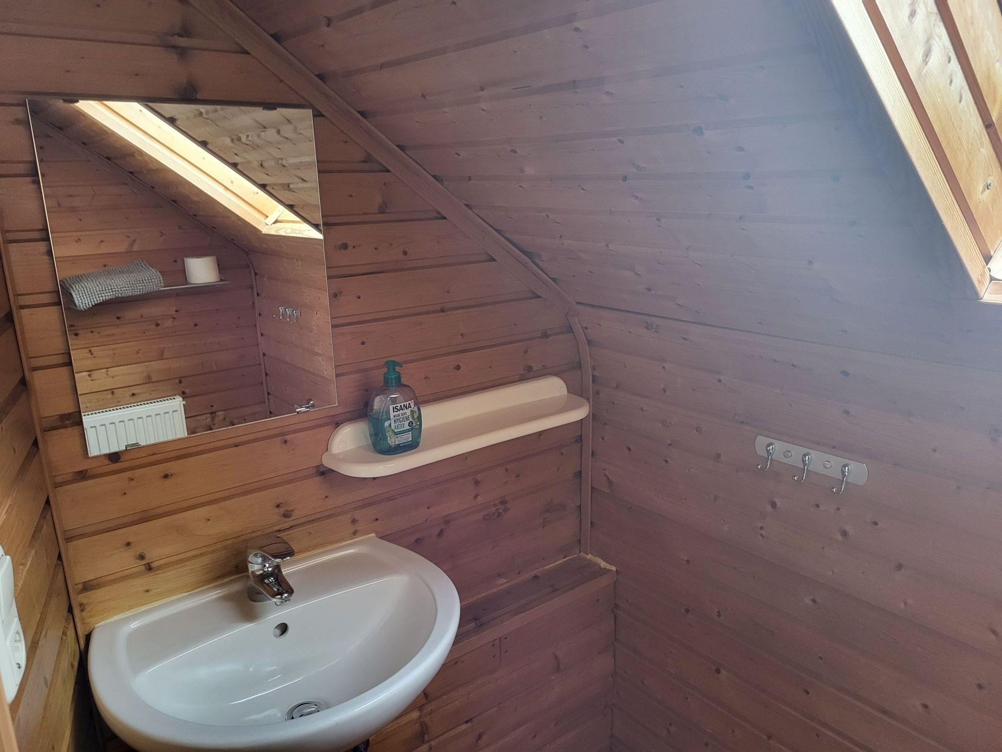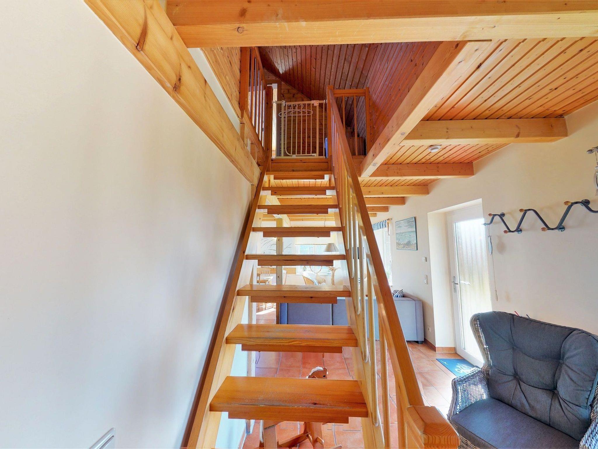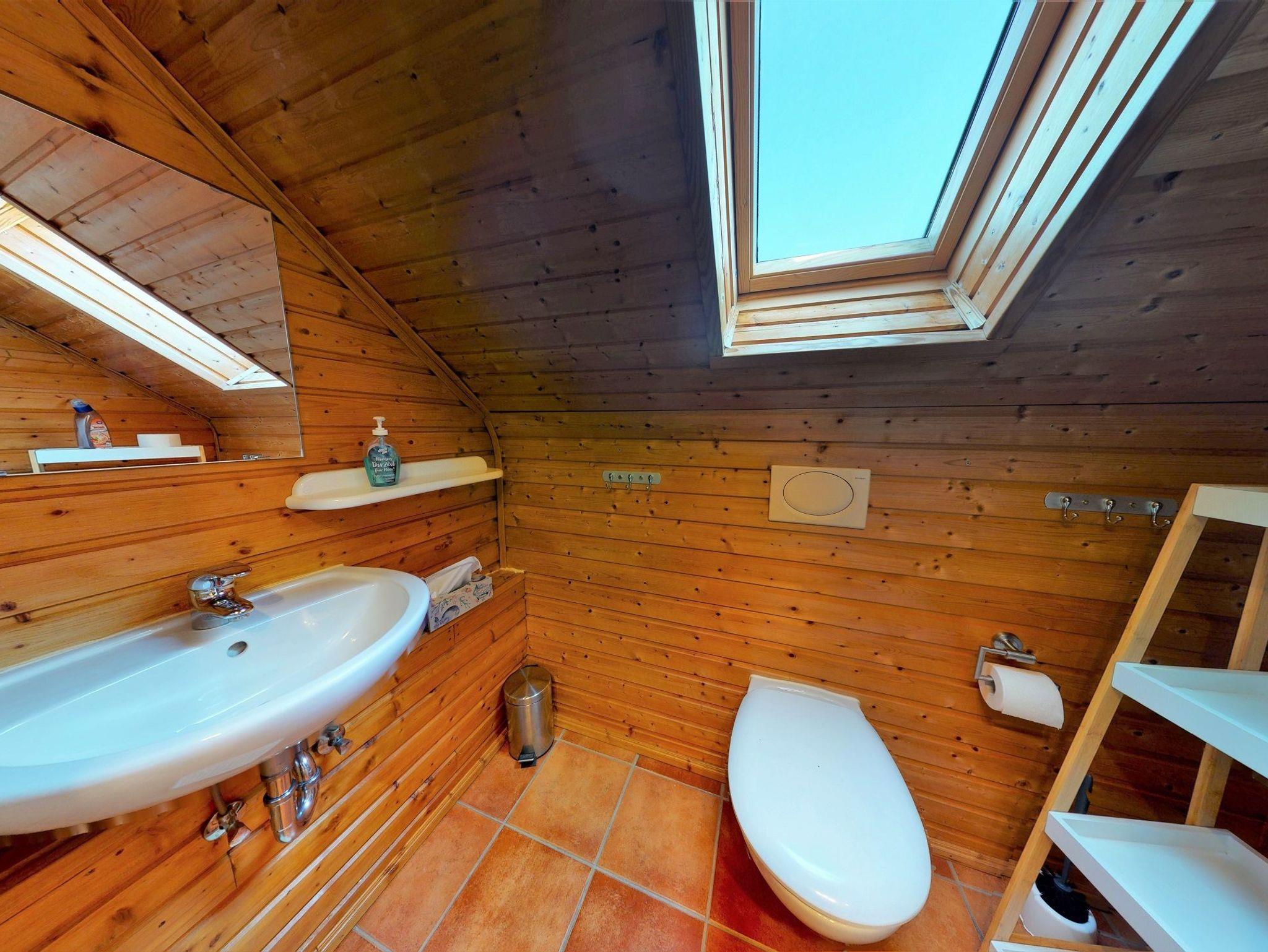 Im Obergeschoss unter den Dachschrägen befinden sich zwei weitere Schlafzimmer. Schlafzimmer 2 ist mit 2 Einzelbetten (je 0,90 m) ausgestattet, die wahlweise zusammen oder getrennt gestellt werden können. In Schlafzimmer 3 stehen 2 Einzelbetten (je 0,80 m) zur Verfügung. Zudem gibt es ein Gäste-WC mit Waschbecken.