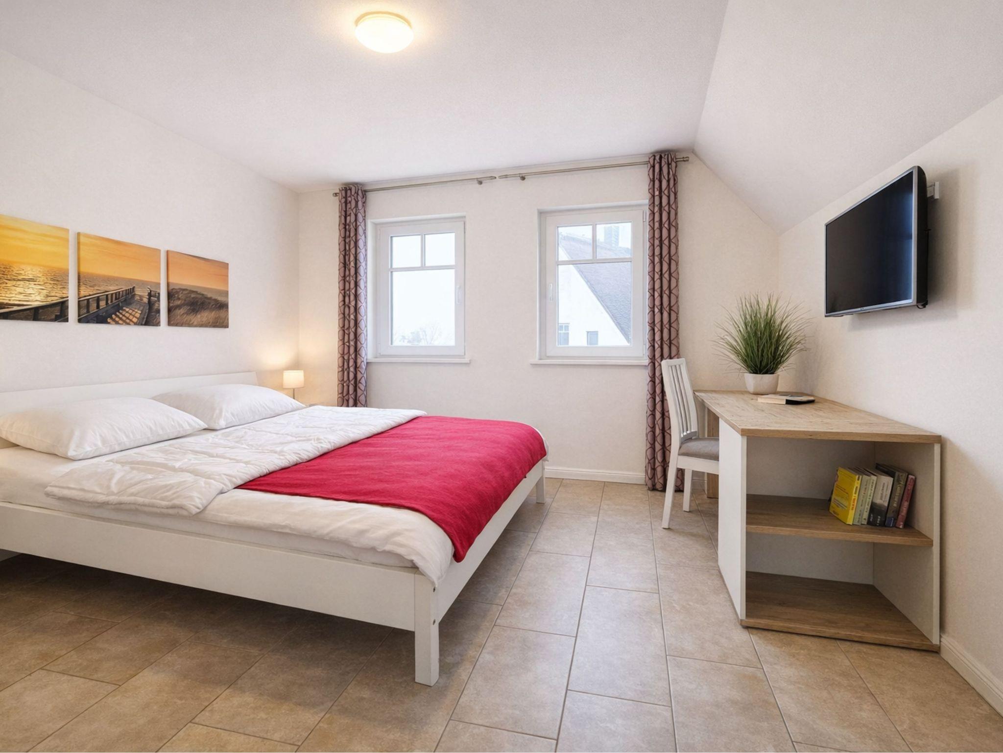 Schlafzimmer 1 mit Doppelbett (1,60 x 2m) und TV. Duschbad/WC und Waschmaschine.