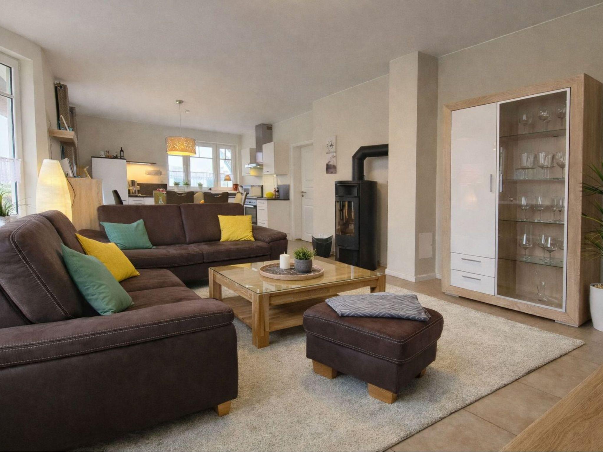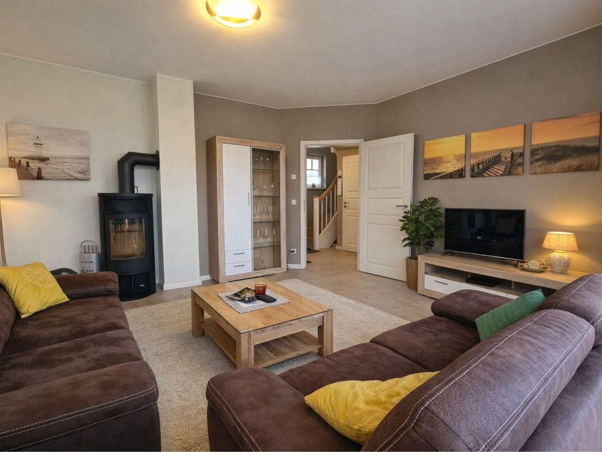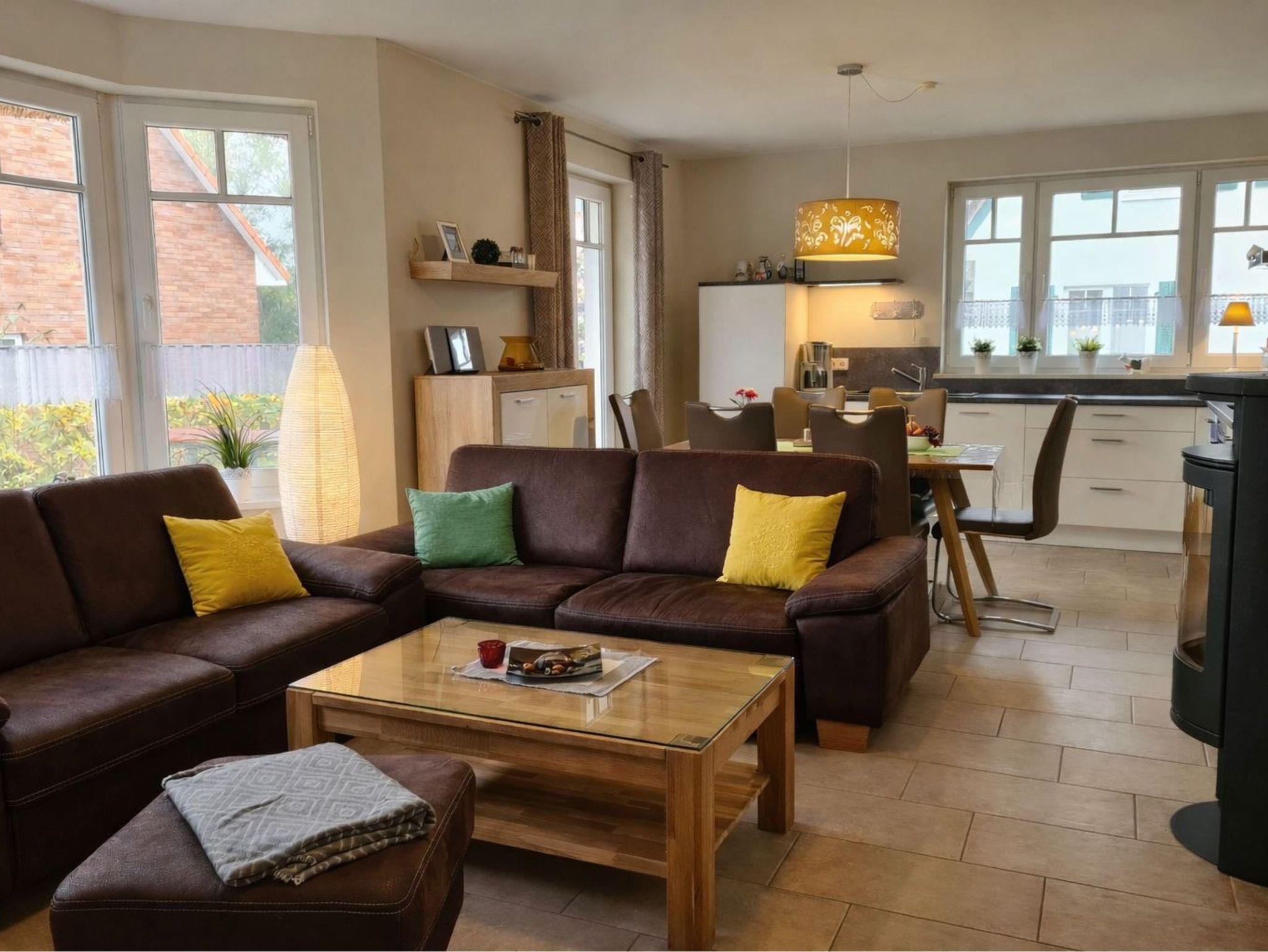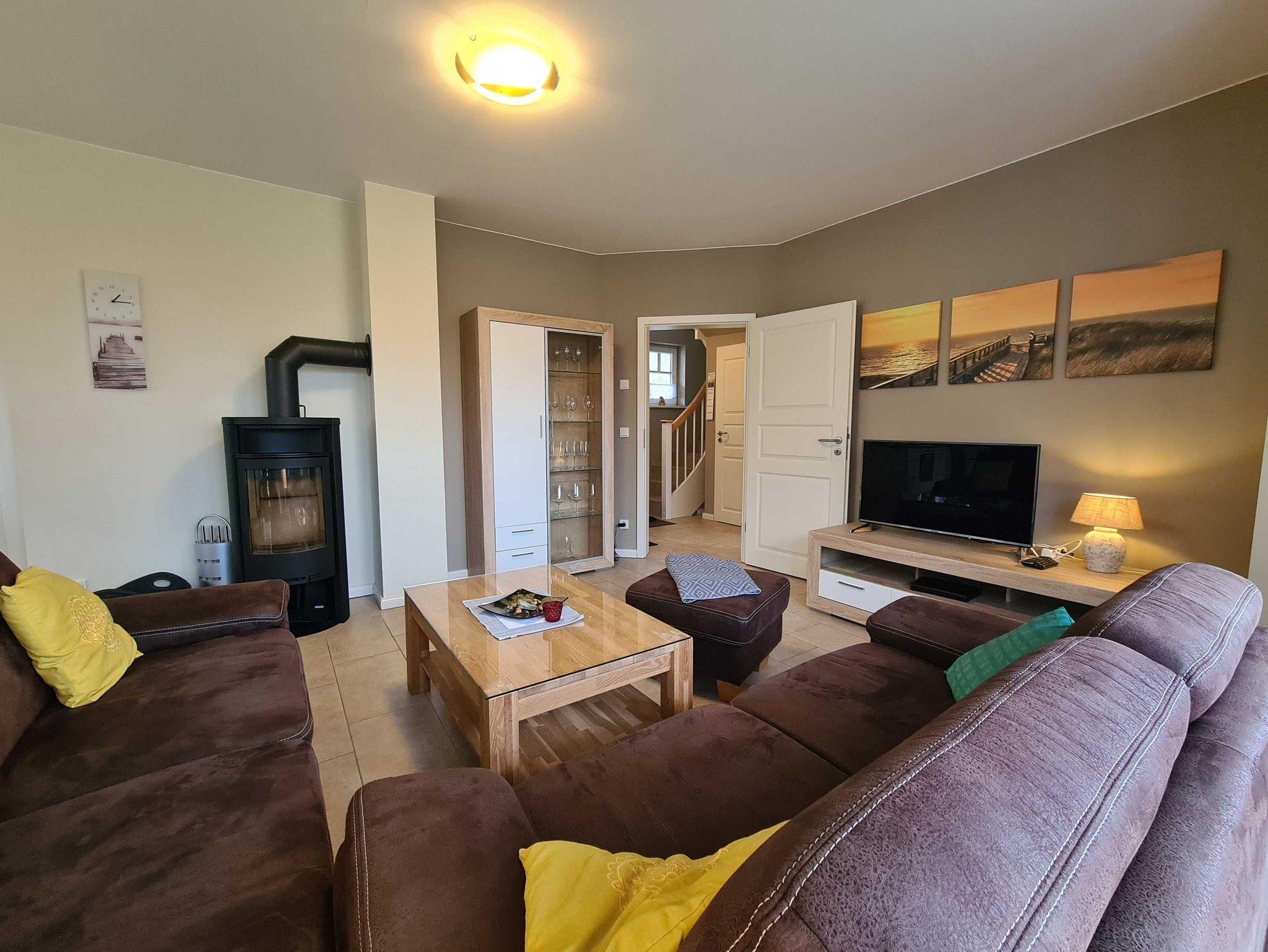 Erdgeschoss: komfortabler Wohnbereich mit Kamin, Einbauküche und Sofas sowie 1 Schlafzimmer, 1x Dusche/ WC.