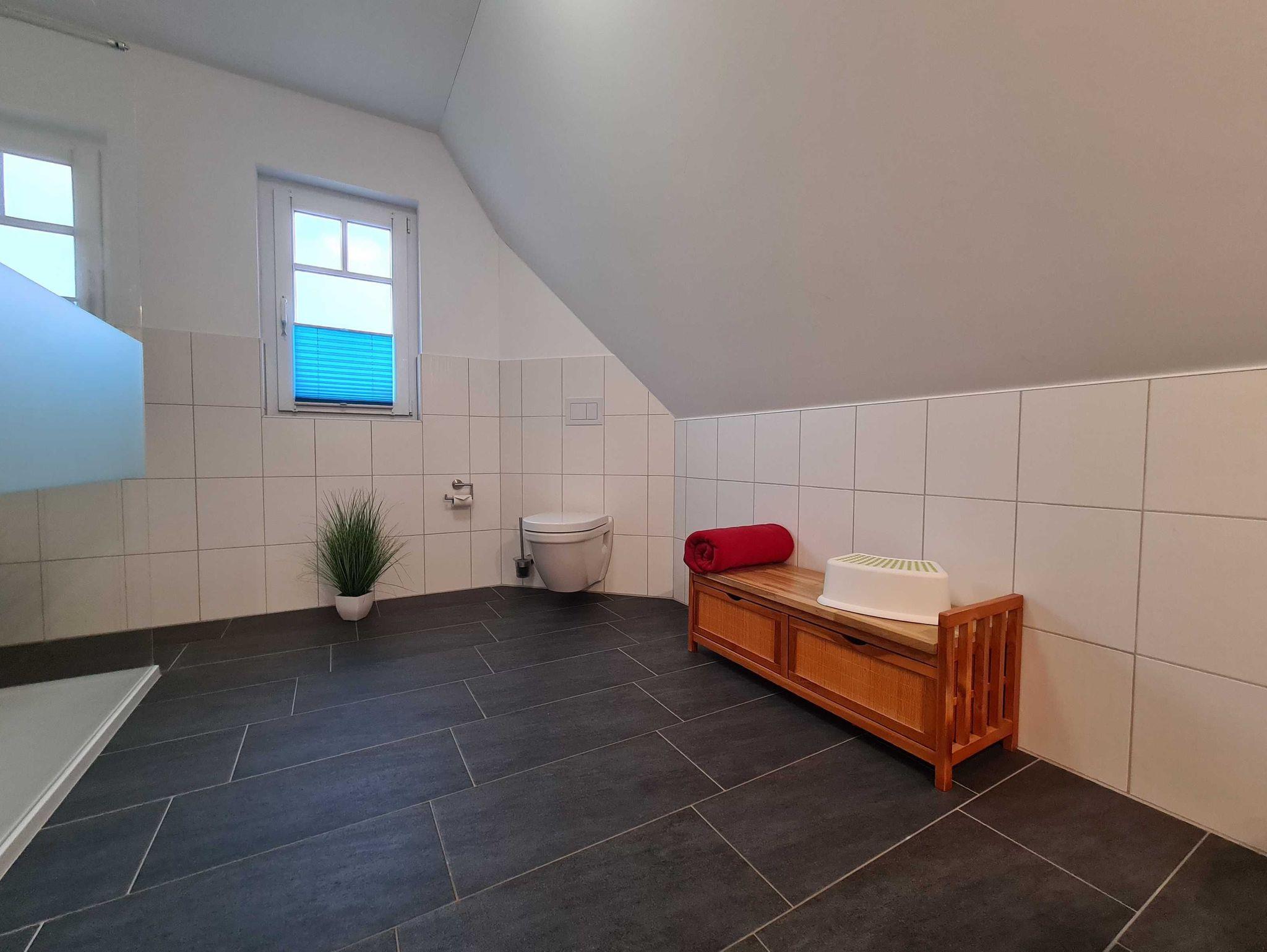 Großzügiges Badezimmer mit ebenerdiger großer Dusche und WC. Sauna mit Fenster.