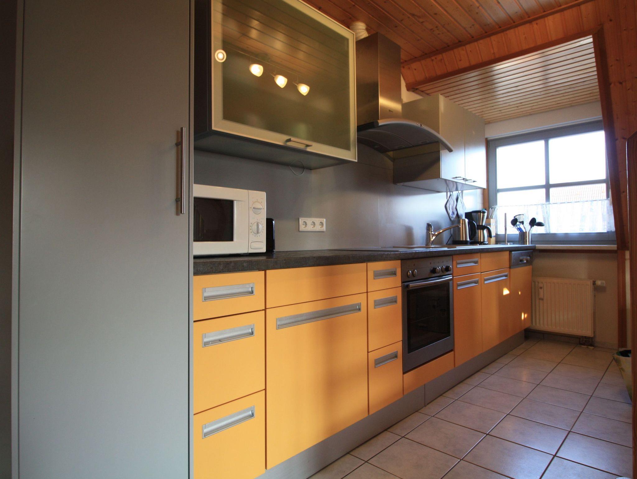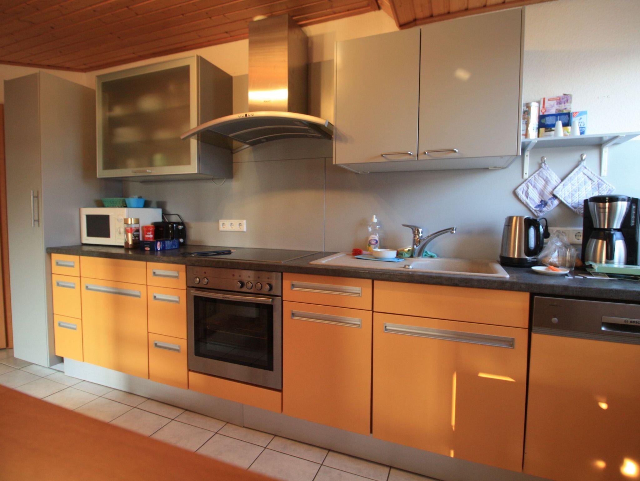 Die offene Komfort-Wohnküche ist mit Spülmaschine, Wasserkocher, Kaffeemaschine, Toaster, Backofen und Mikrowelle sowie Geschirr und Kochutensilien komplett ausgestattet.