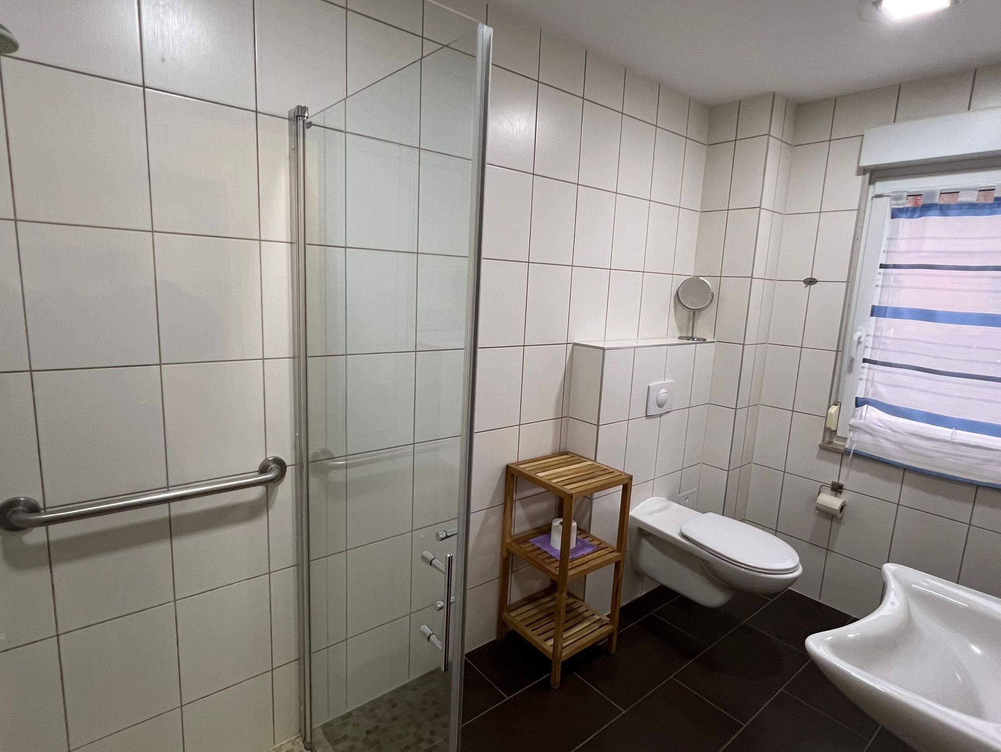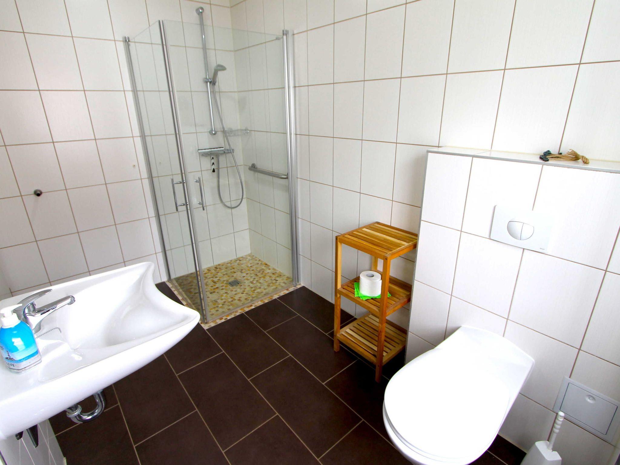 Das Bad ist mit einer ebenerdigen Dusche ausgestattet.