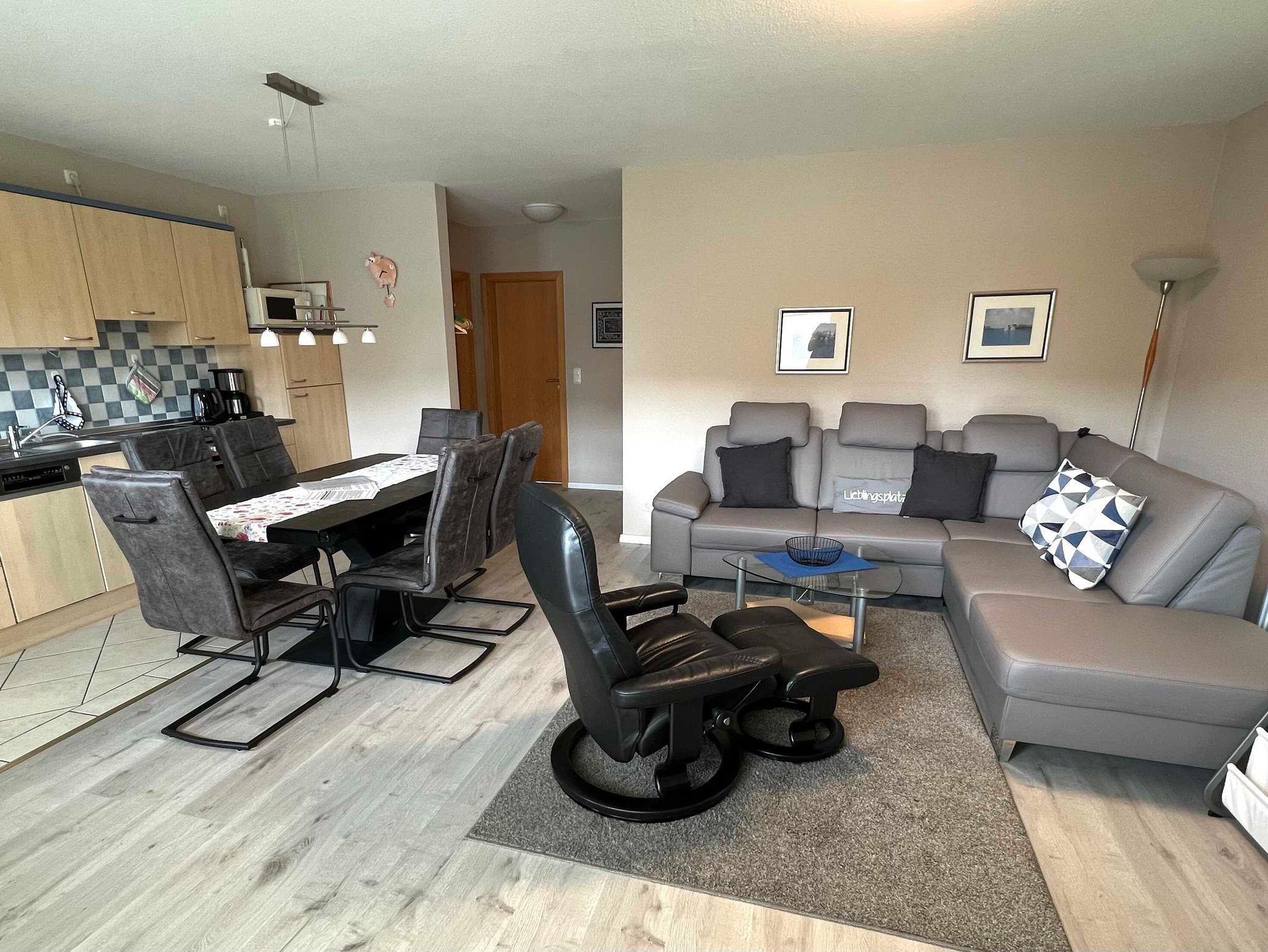 Sie verfügt über einen hellen, lichtdurchfluteten Wohnraum mit Couchecke, Fernsehsessel,Sat- TV und WLAN.