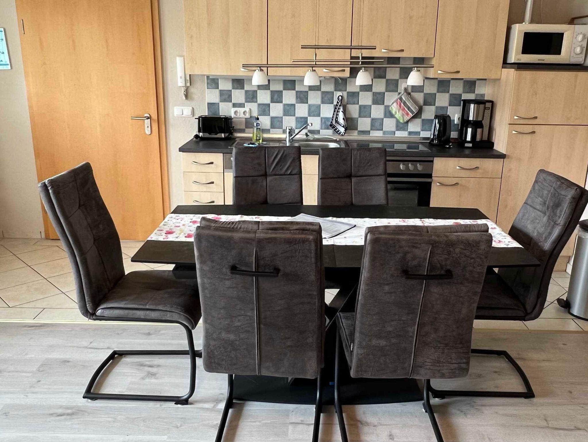 Der angegliederte Essbereich besteht aus einem großen Esstisch mit ausreichend bequemen Stühlen.