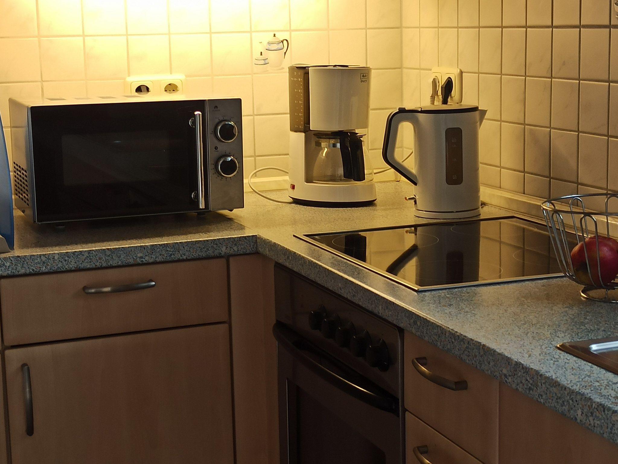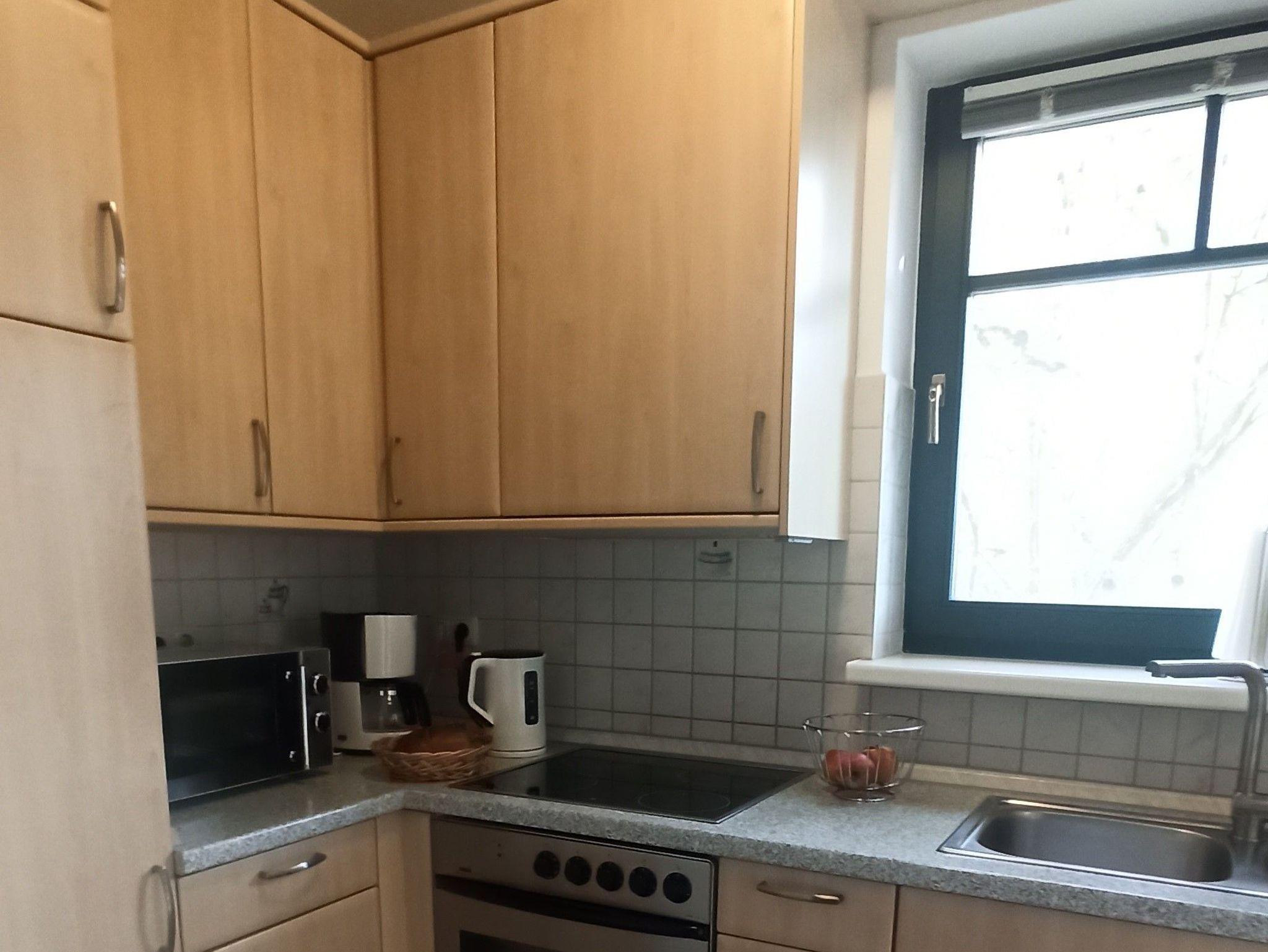 Nebenan, durch eine Tür getrennt, befindet sich die Küche, die über einen Herd, Backofen, Spülmaschine, Kühlschrank mit Gefrierfach, eine Mikrowelle und eine Kaffeemaschine verfügt. Auf dieser Etage steht Ihnen außerdem ein Gäste-WC zur Verfügung.