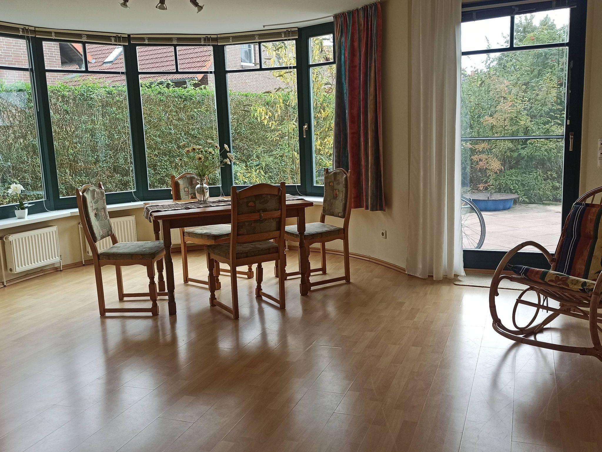 Im Erdgeschoss befindet sich das geräumige Wohnzimmer mit einem sehr schönen Essbereich in einem Halbrund aus Fenstern, so dass viel Licht die Sinne erfreut. Und sollte es wirklich einmal regnen, haben sie im Sitzbereich den Raum zum Nichtstun, Lesen oder was sie auch immer mögen. Ein Fernseher mit SAT-Anschluss sowie eine Stereoanlage mit CD-Player steht Ihnen ebenfalls zur Verfügung. Natürlich haben Sie überall im Haus WLAN-Verbindung.