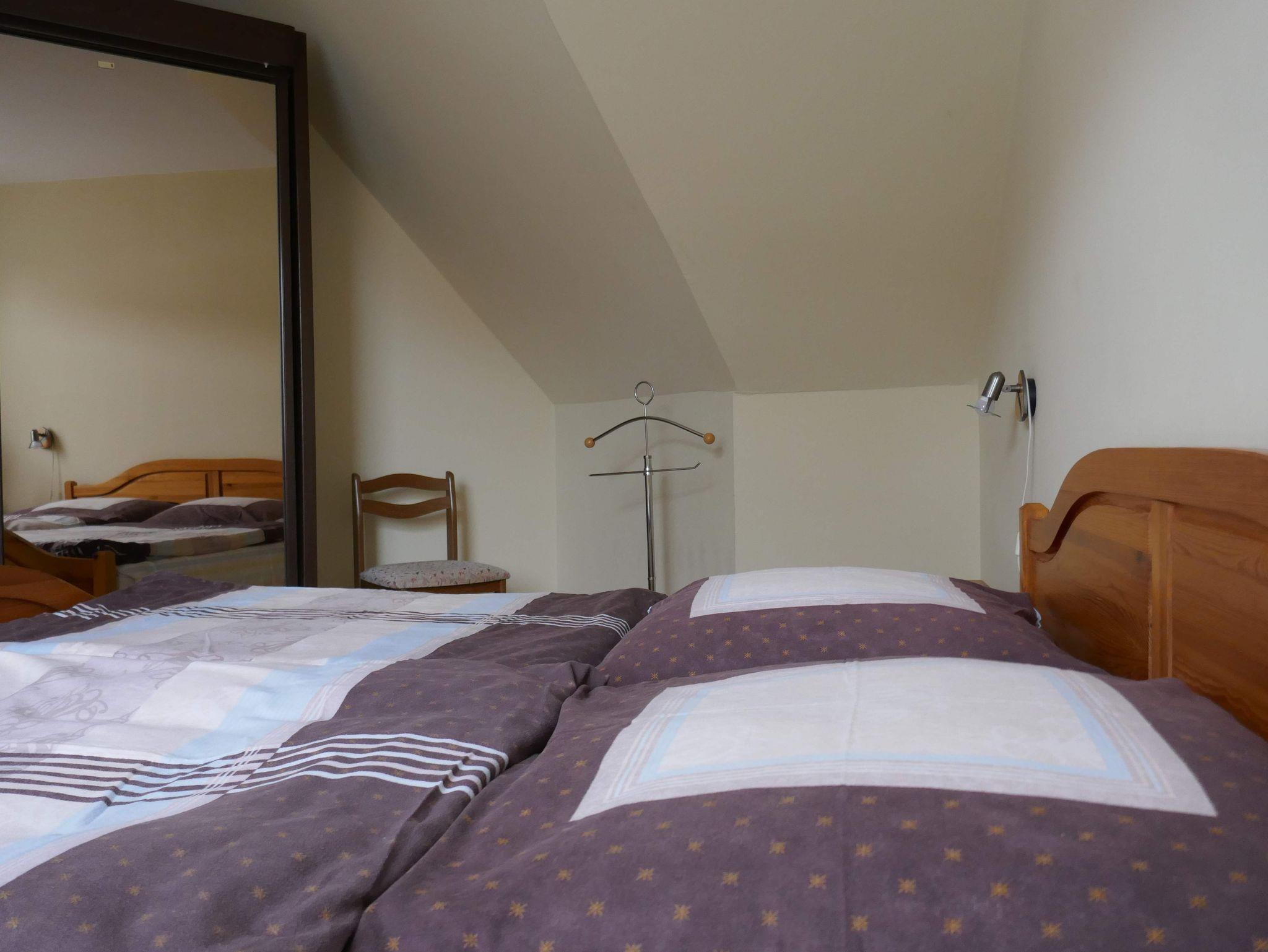 Im Obergeschoss des Hauses befinden sich die beiden Schlafzimmer. Diese verfügen einmal über ein Doppelbett (1,80 m x 2,00 m) und zum anderen über zwei Einzelbetten (je 0,90 m x 2,00 m) sowie je einen Kleiderschrank. Von hier haben Sie Zugang zum Balkon. Das vorhandene Kinderbett stellen Sie je nach Wunsch auf. Auf dieser Etage steht Ihnen darüber hinaus ein großes Duschbad mit Badewanne, Waschbecken, Bidet und WC zur Verfügung. Wünschen Sie Handtücher und Bettwäsche für Ihren Aufenthalt, so können Sie diese zusätzlich buchen.