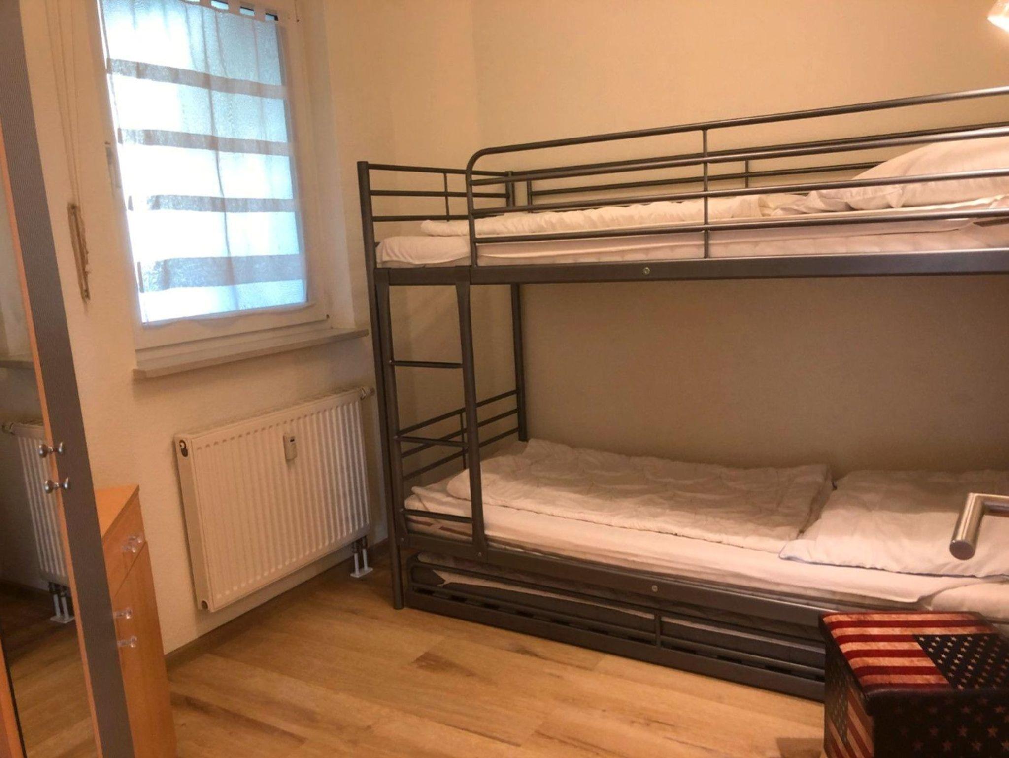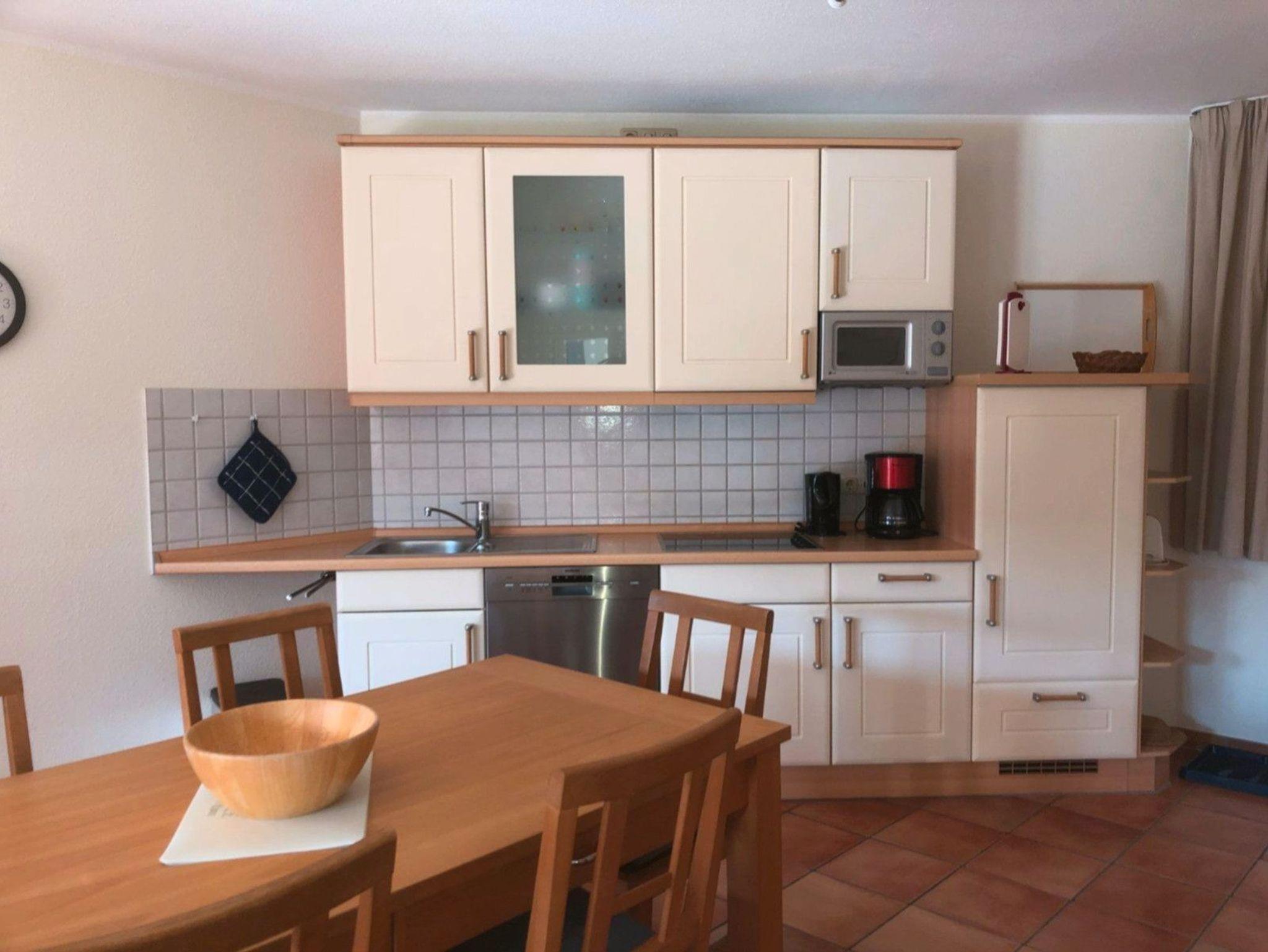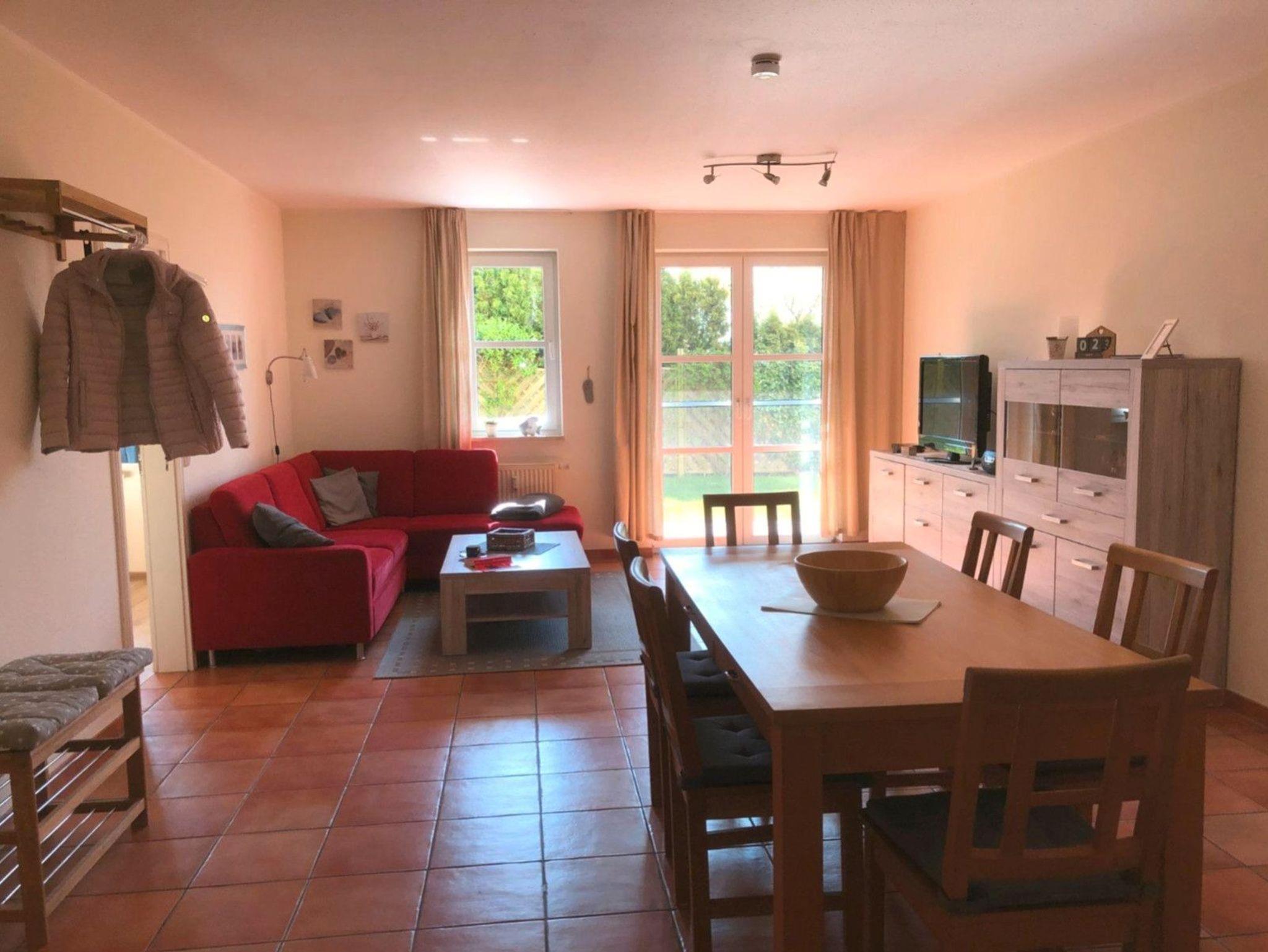 Unsere Ferienwohnung liegt im EG der Residenz am Kurhaus und bietet Platz für 4, max 5 Personen. Die Wohnung verfügt über einen großzügig geschnittenen Wohnraum mit voll eingerichteter Küchenzeile und direktem Zugang zur Terrasse sowie über ein Doppelschlafzimmer, ein Kinderzimmer mit Etagen- und Ausziehbett sowie ein Duschbad. Es handelt sich um eine Nichtraucherwohnung. Haustiere sind nach Absprache willkommen.