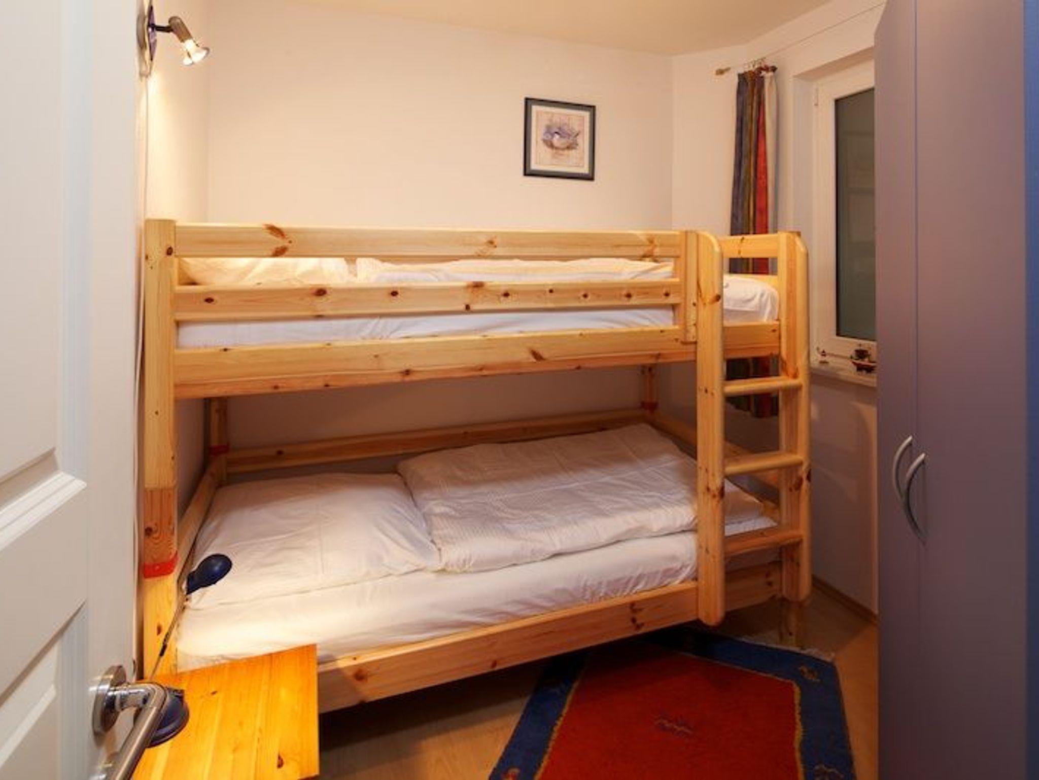 2 Schlafzimmer: 1x Doppelbett, 1x Etagenbett, Kinderstuhl, Kinderbett,