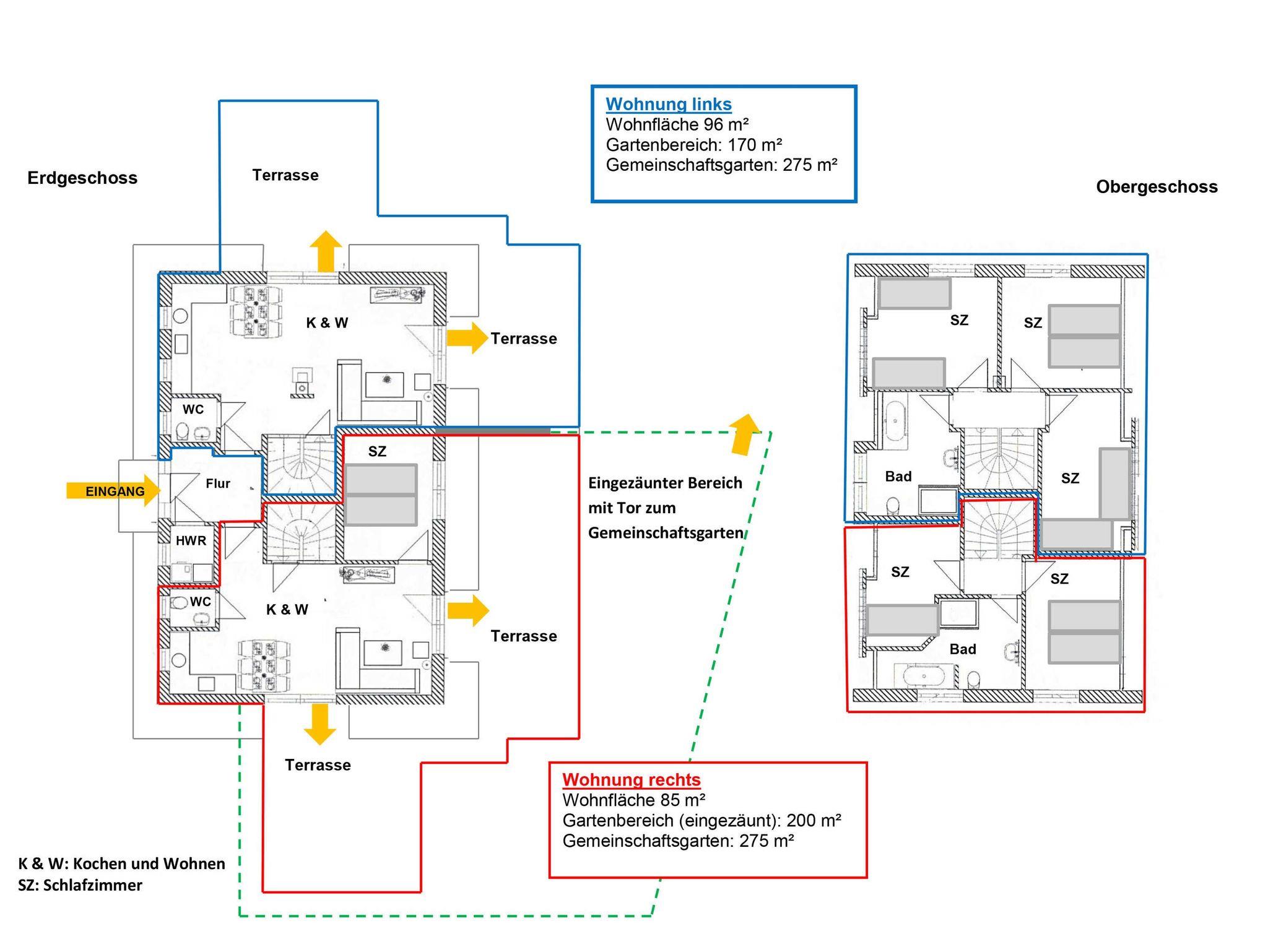 Eigener eingezäunter Garten (170m²) & Garten zur gemeinschaftlichen Nutzung (275 m²), Terrasse mit Gartenmöbeln (Sitz-/ Essgruppe und Lounge Garnitur) sowie der abschließbare Gemeinschaftsschuppen mit Ladestation für E-Bikes für alle Gäste nutzbar. Elektro- Tisch- Grill vorhanden.