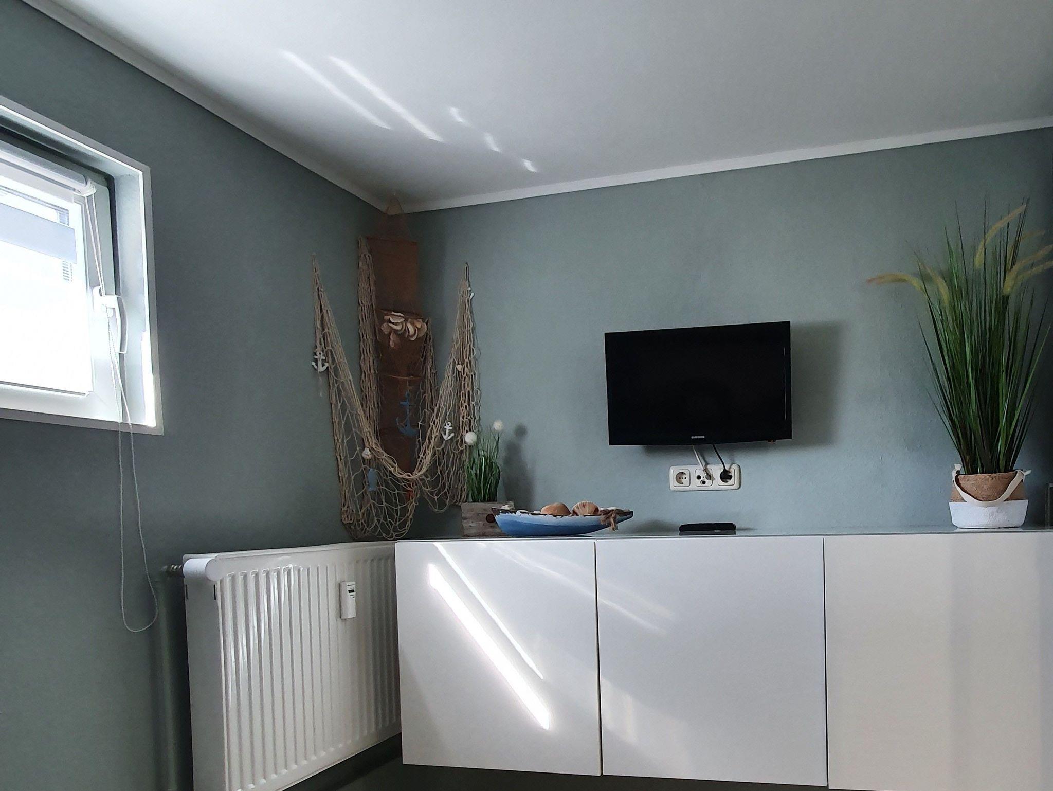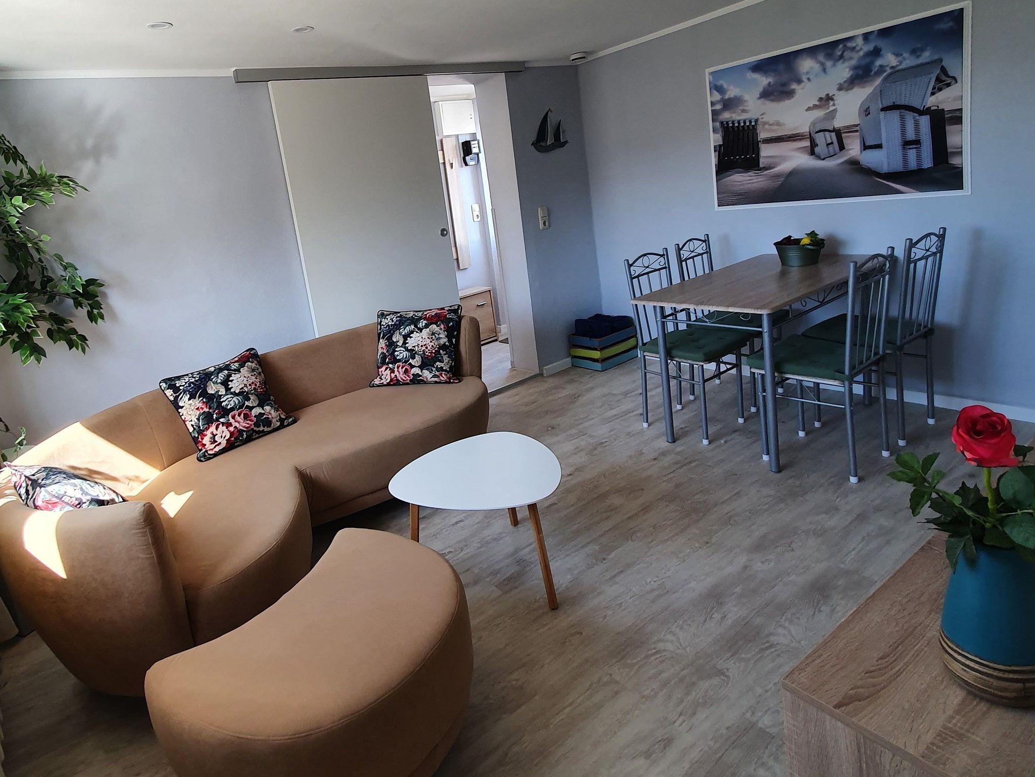 Der gemütliche Wohnraum ist mit einer Ess- und Couchecke eingerichtet. Nach einem ereignisreichen Urlaubstag legen Sie hier die Füße hoch und entspannen bei einem netten Film und einem Glas Wein.