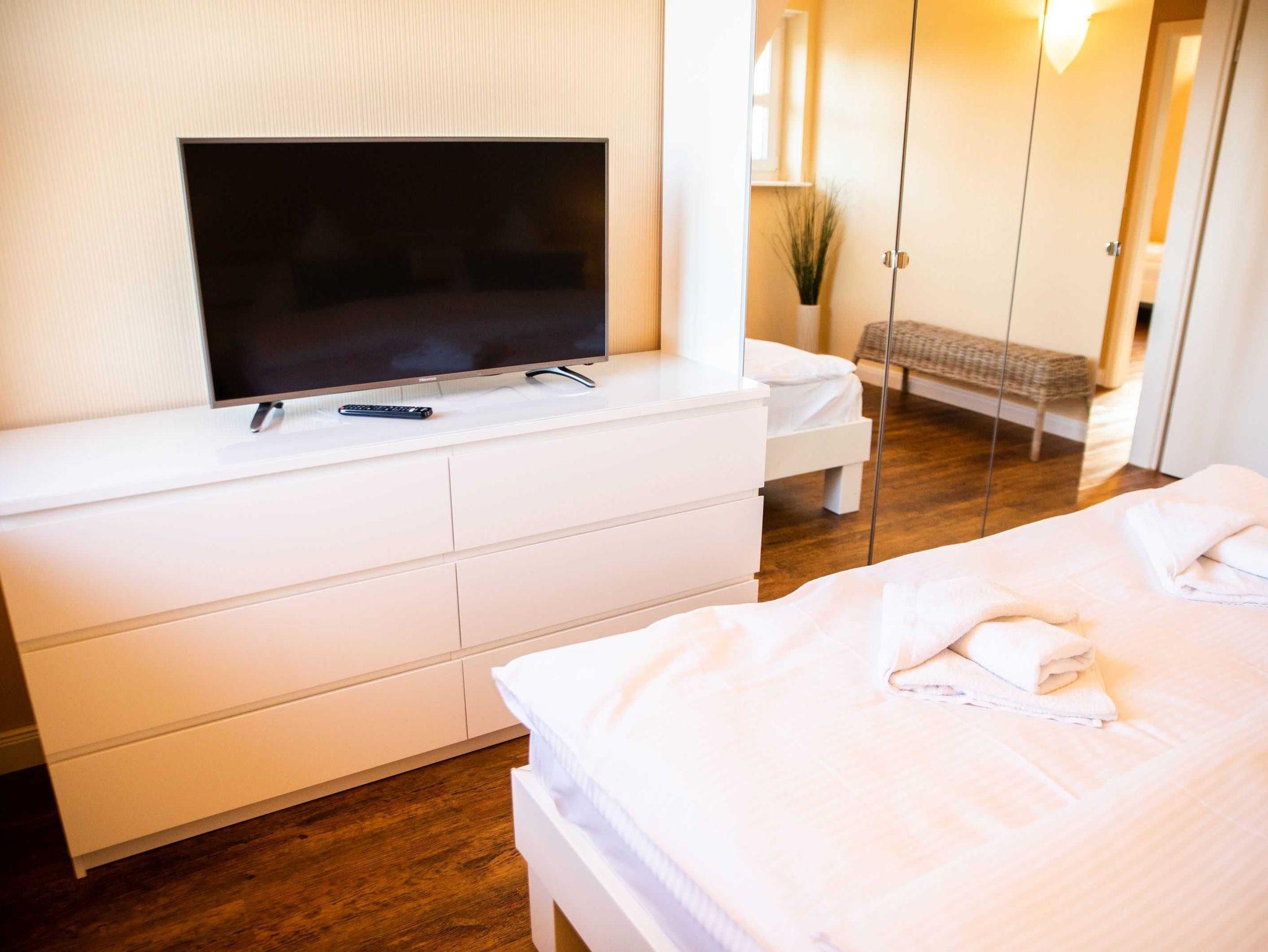 Die drei Schlafzimmer befinden in der oberen Etage. Zwei haben jeweils ein Doppelbett (2m x 2m) mit Nachttischen, einen Kleiderschrank und eine Kommode. Das dritte Schlafzimmer hat zwei Einzelbetten (100 x 200 cm) mit Nachttischen, Kleiderschrank und Kommode. In allen Schlafräumen sind Fernseher mit SAT-TV vorhanden. Für unsere kleinen Gäste stehen zudem ein Kinderreisebett und ein Kinderstuhl bereit. Im Haus befinden sich zwei Badezimmer jeweils ausgestattet mit Dusche und WC. Zusätzlich befindet sich eine Sauna im EG-Bad und eine Badewanne im OG-Bad.