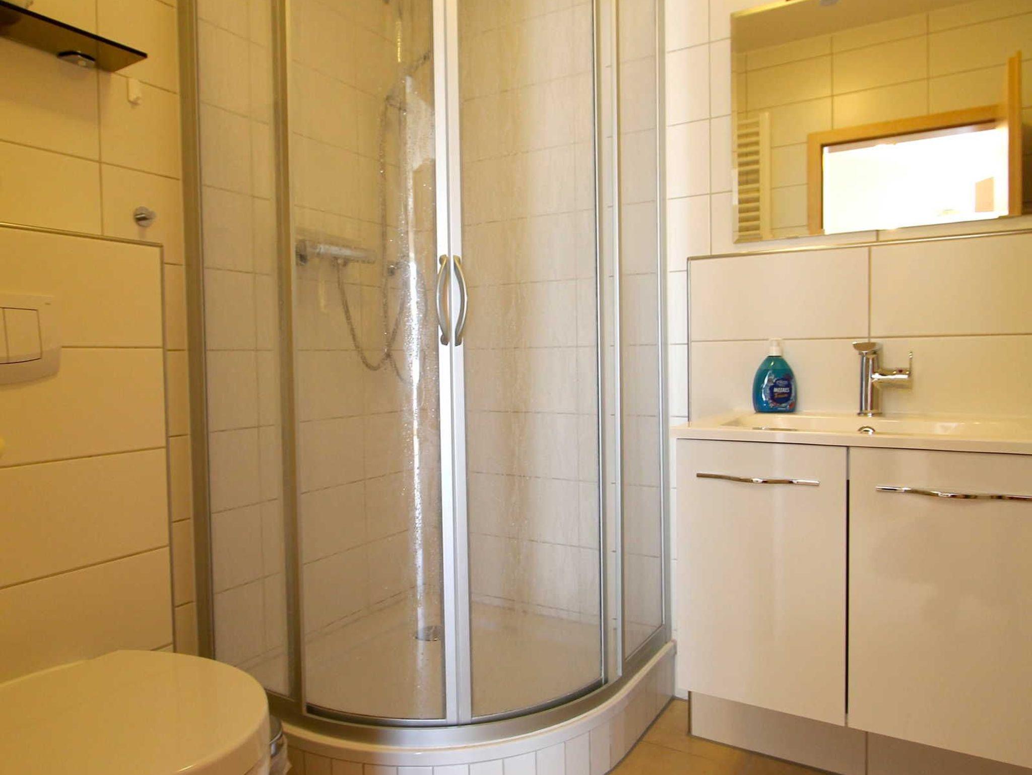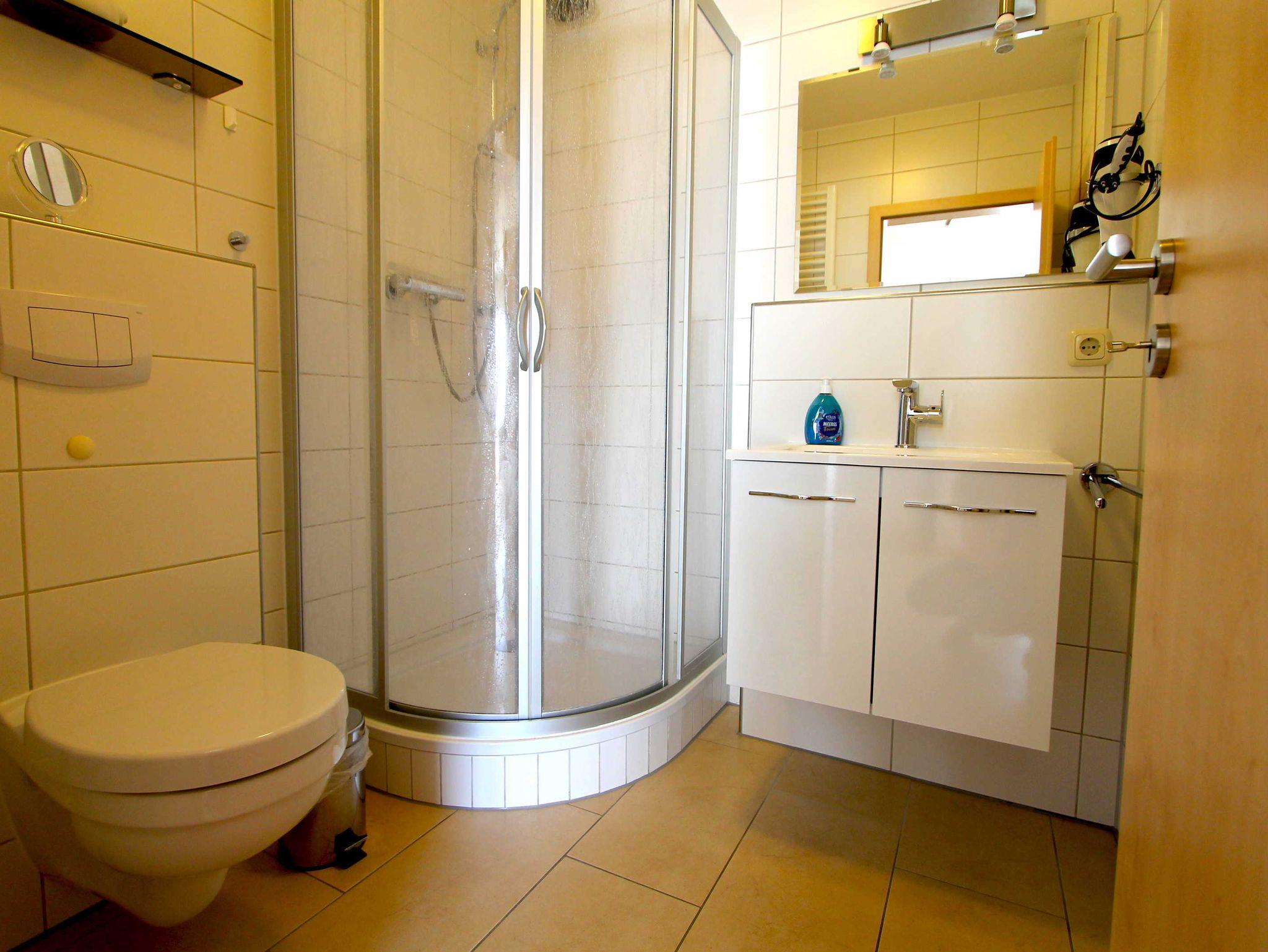 Das Bad hat eine Dusche, Fußbodenerwärmung über Heizungsrücklauf, Handtuchwärmer und einen Föhn.
