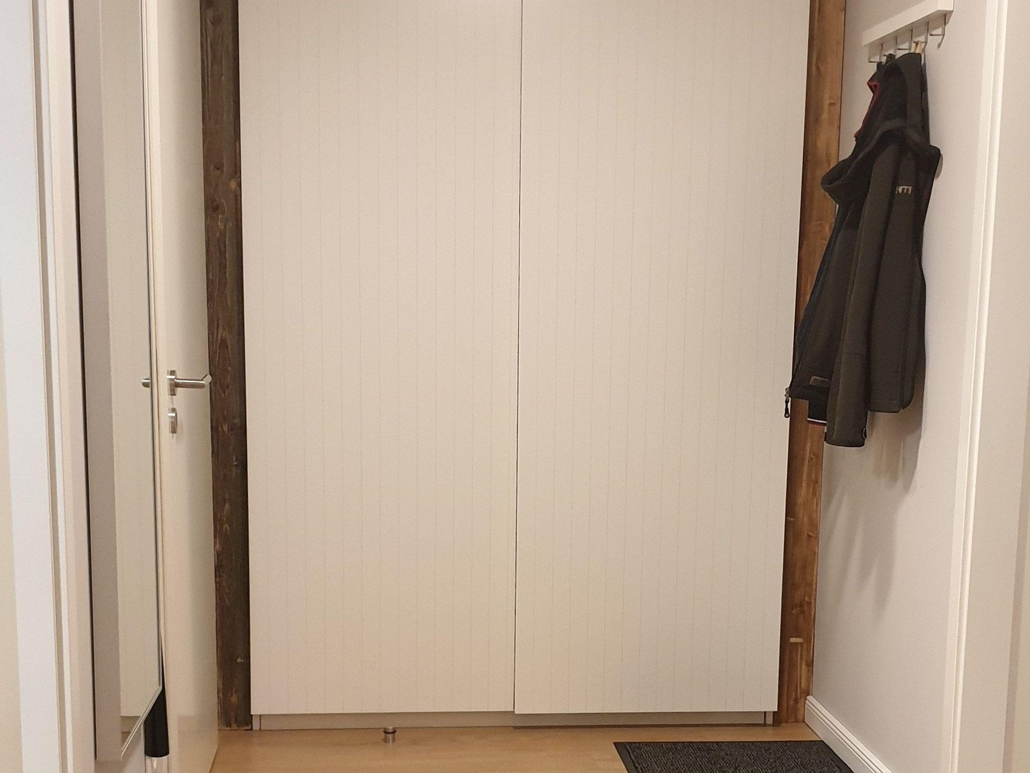Ein Boxsprindoppelbett und Einbauschrank im Wohnbereich.
