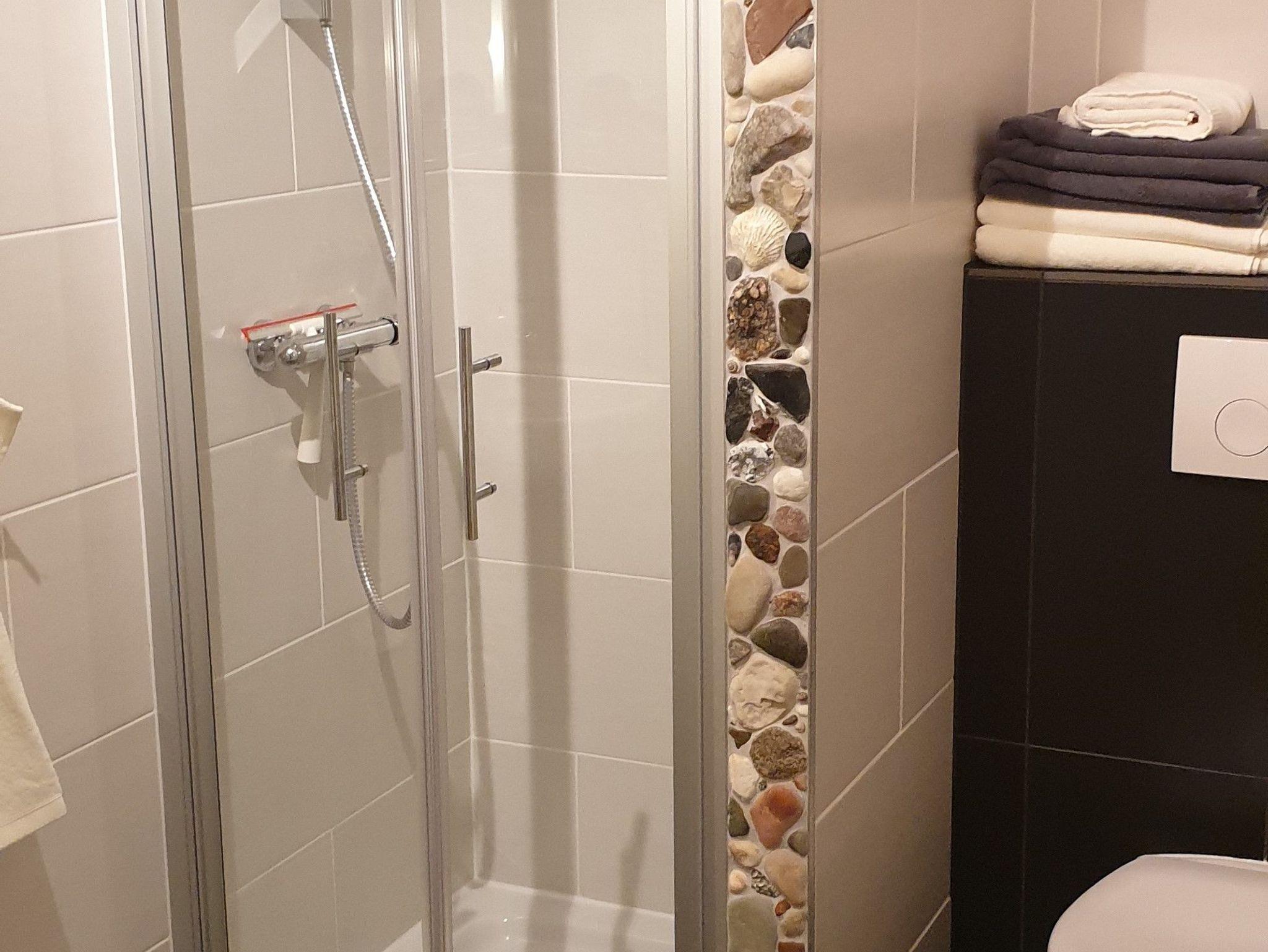 Ein Bad mit liebevoll gestalteter Dusche, WC, Waschbecken, Fön.