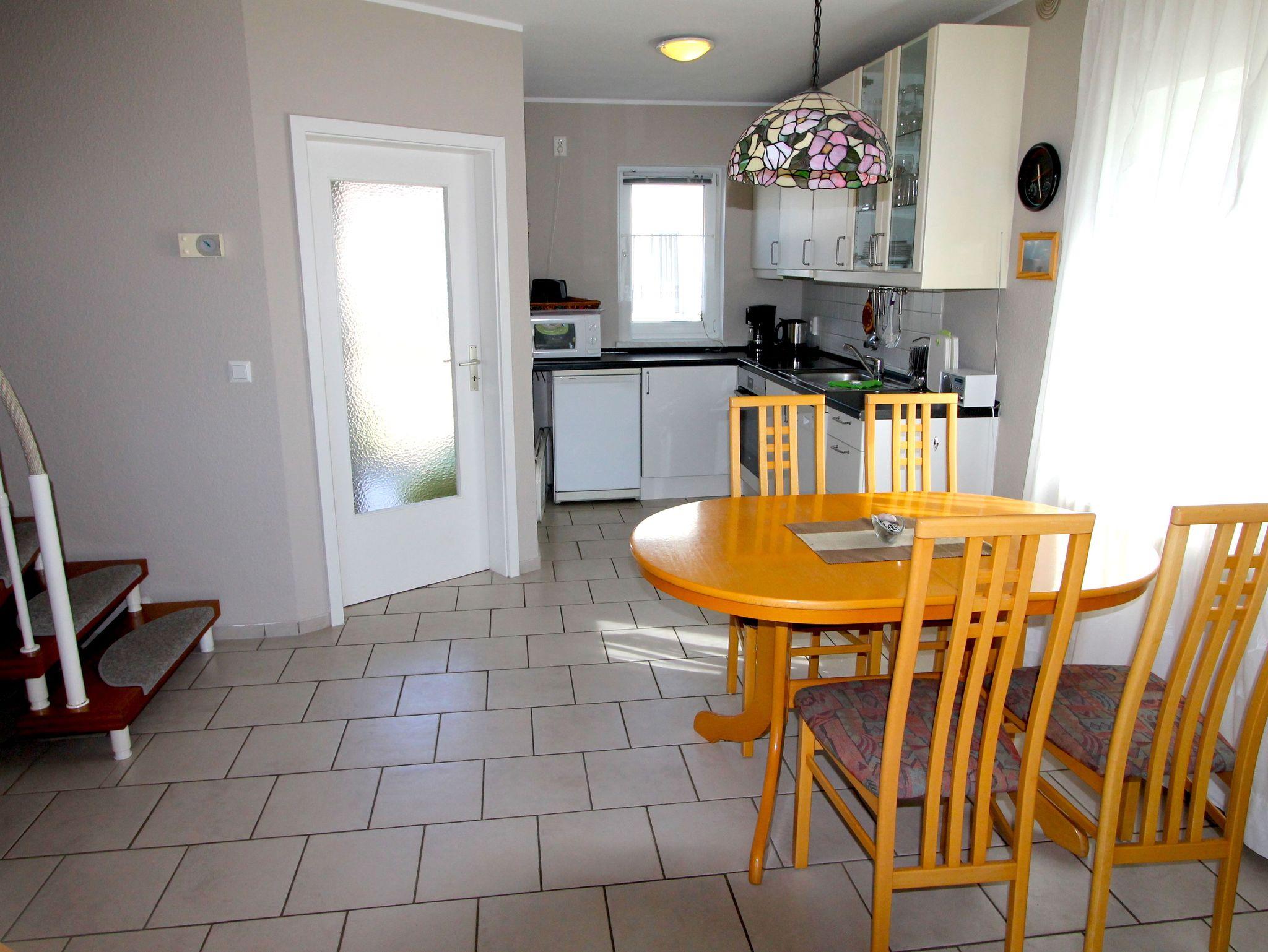 Darin integriert ist der Essbereich mit Esstisch und Stühen sowie die komplett ausgestattete Küchenzeile mit Herd- Backofen, Kühlschrank mit Gefrierfach sowie Geschirrspüler und vielem mehr.