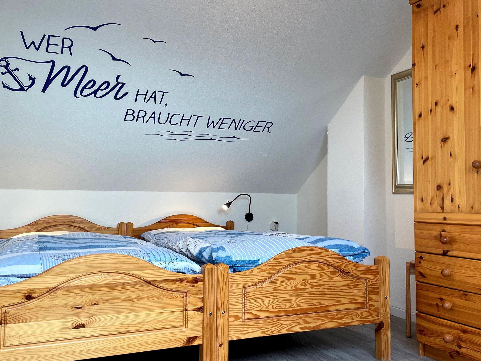 Das untere Schlafzimmer ist mit 1 Doppelbett (180 x 200), das obere mit 2 Einzelbetten ausgestattet.