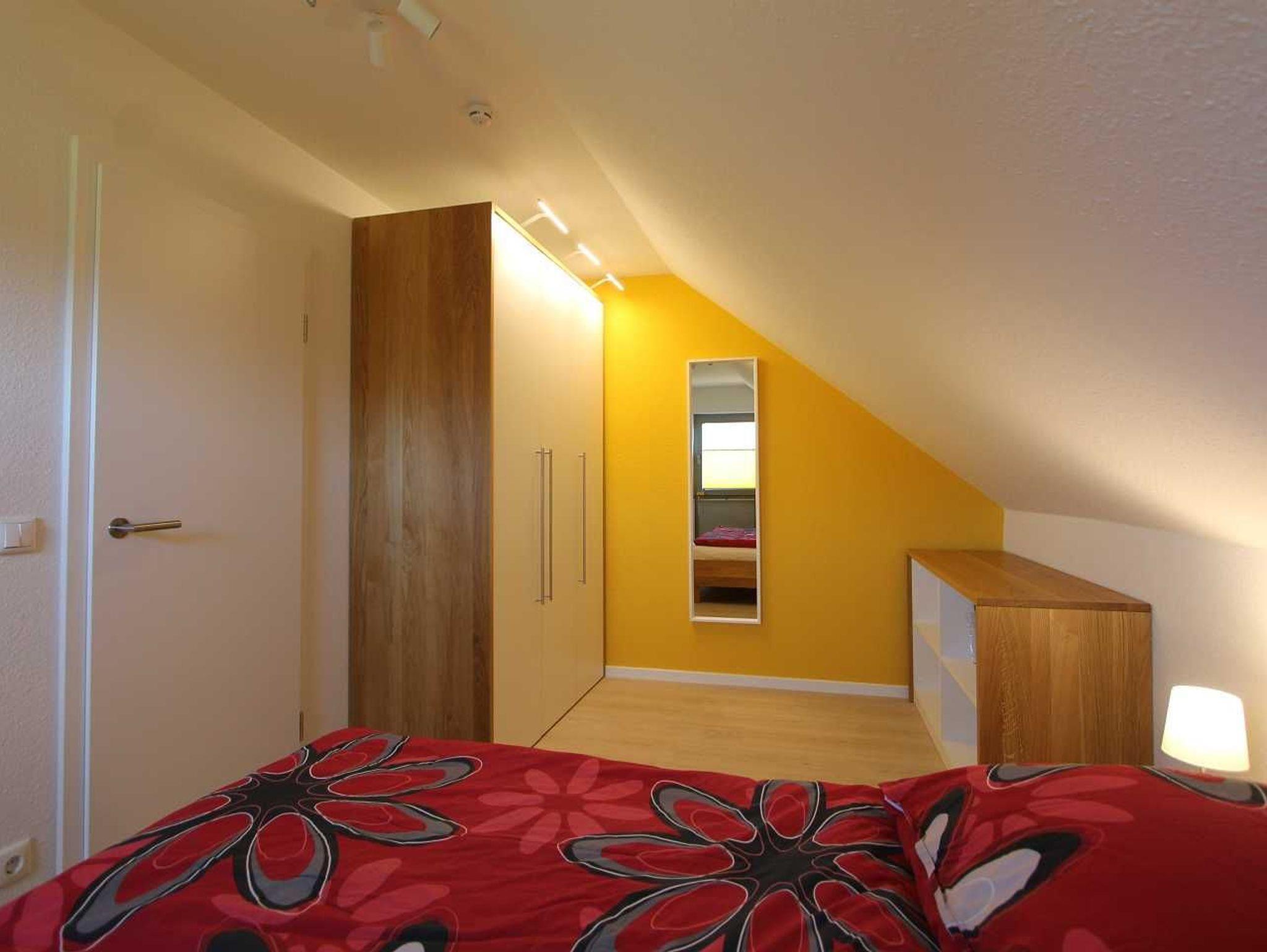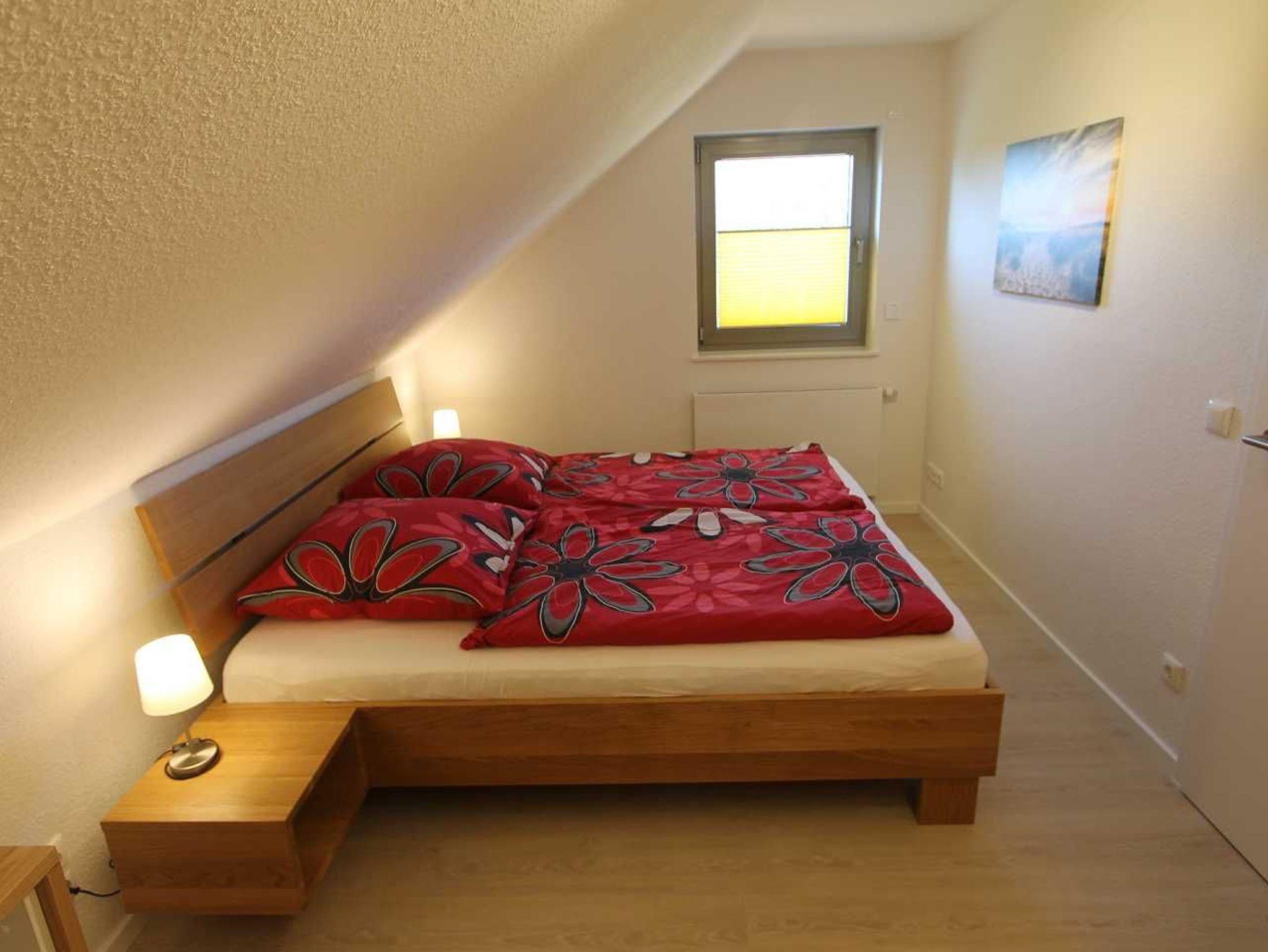 Das große Schlafzimmer ist mit einem Doppelbett 180x200 aus Naturholz, einem Kleiderschrank und einer Regalablage ausgestattet. Die Lattenroste sind bei allen Betten im Kopf,- und Fußteil verstellbar, die Matratzen besitzen je nach Wendung 2 Härtegrade.