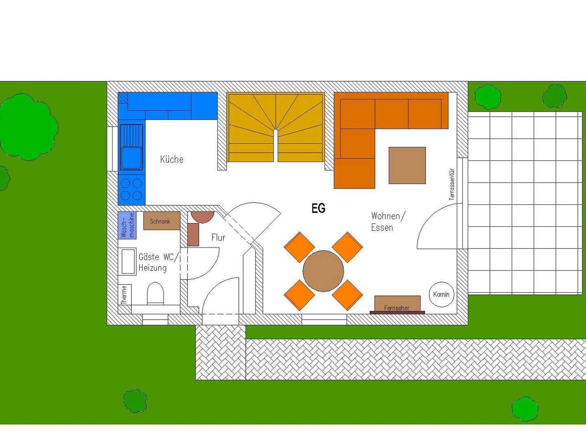 Im Erdgeschoß befindet sich Flur, Küche, separates WC mit Waschmaschine und der Wohn, -und Essbereich. Im Obergeschoß befinden sich 1 großes und 1 kleines Schlafzimmer sowie das Bad.