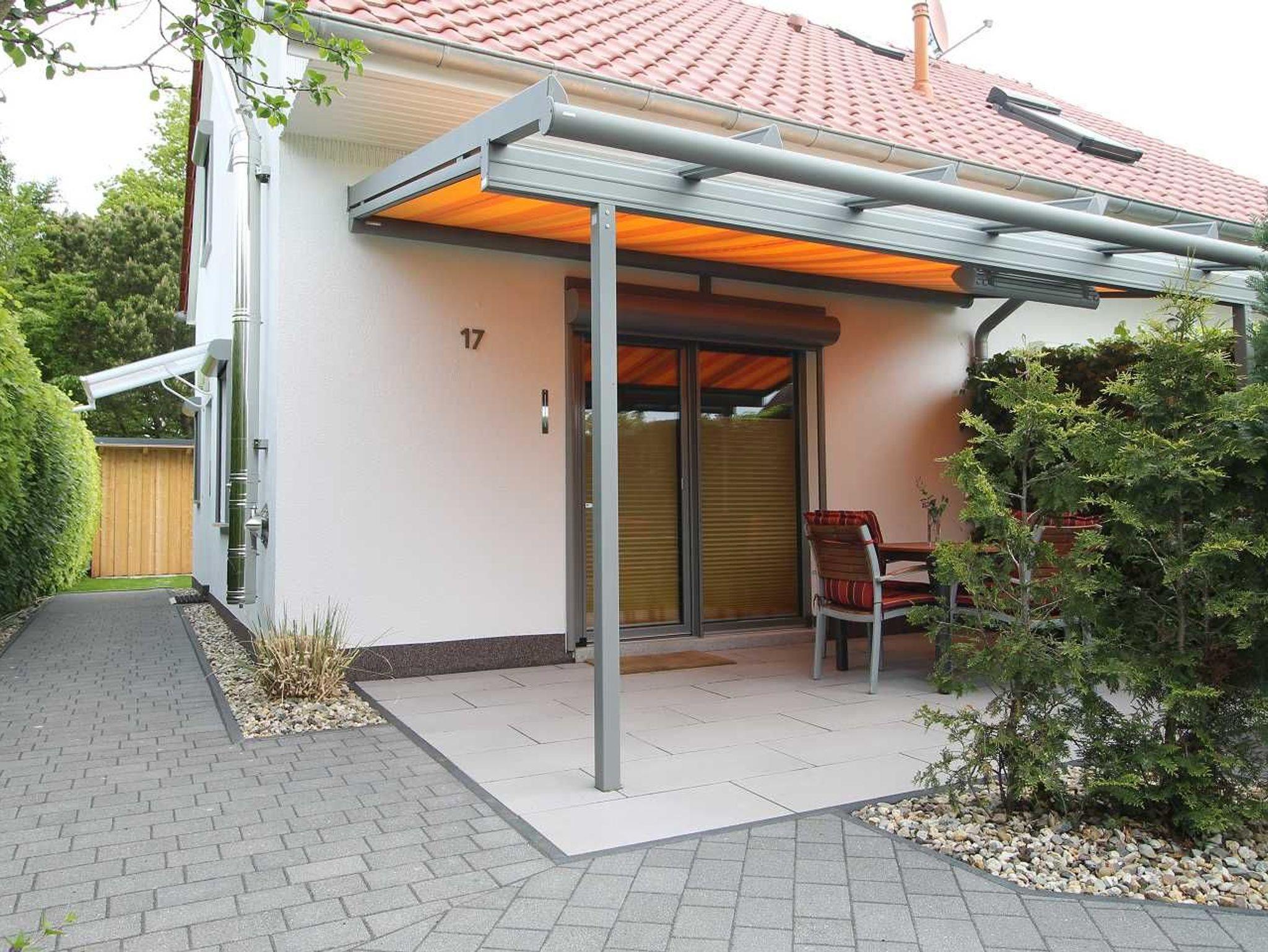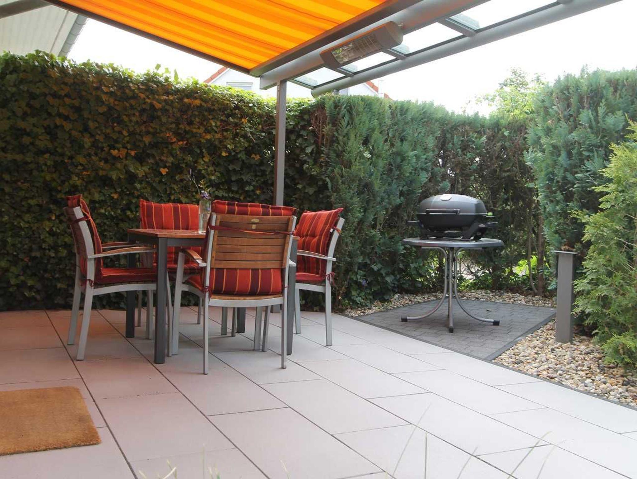 Vom Wohnraum aus erschließt sich die Terrasse, welche mit einem Glas-Terrassendach überdacht ist, so kann sie bei jedem Wetter genutzt werden. Für Schatten sorgt eine elektrisch bedienbare Markise. In den Abendstunden können Sie sich es durch dimmbares Licht im Terrassendach gemütlich machen, sollten die Abende kühler sein, schalten sie einfach den vorhandenen Infrarot Strahler am Dach ein und genießen Sie weiter. Es ist eine Einzelterrasse, so ist ihre Privatsphäre jederzeit geschützt. Terrassenmöbel sind vollständig vorhanden, die Auflagen befinden sich im Haus unter der Treppe.