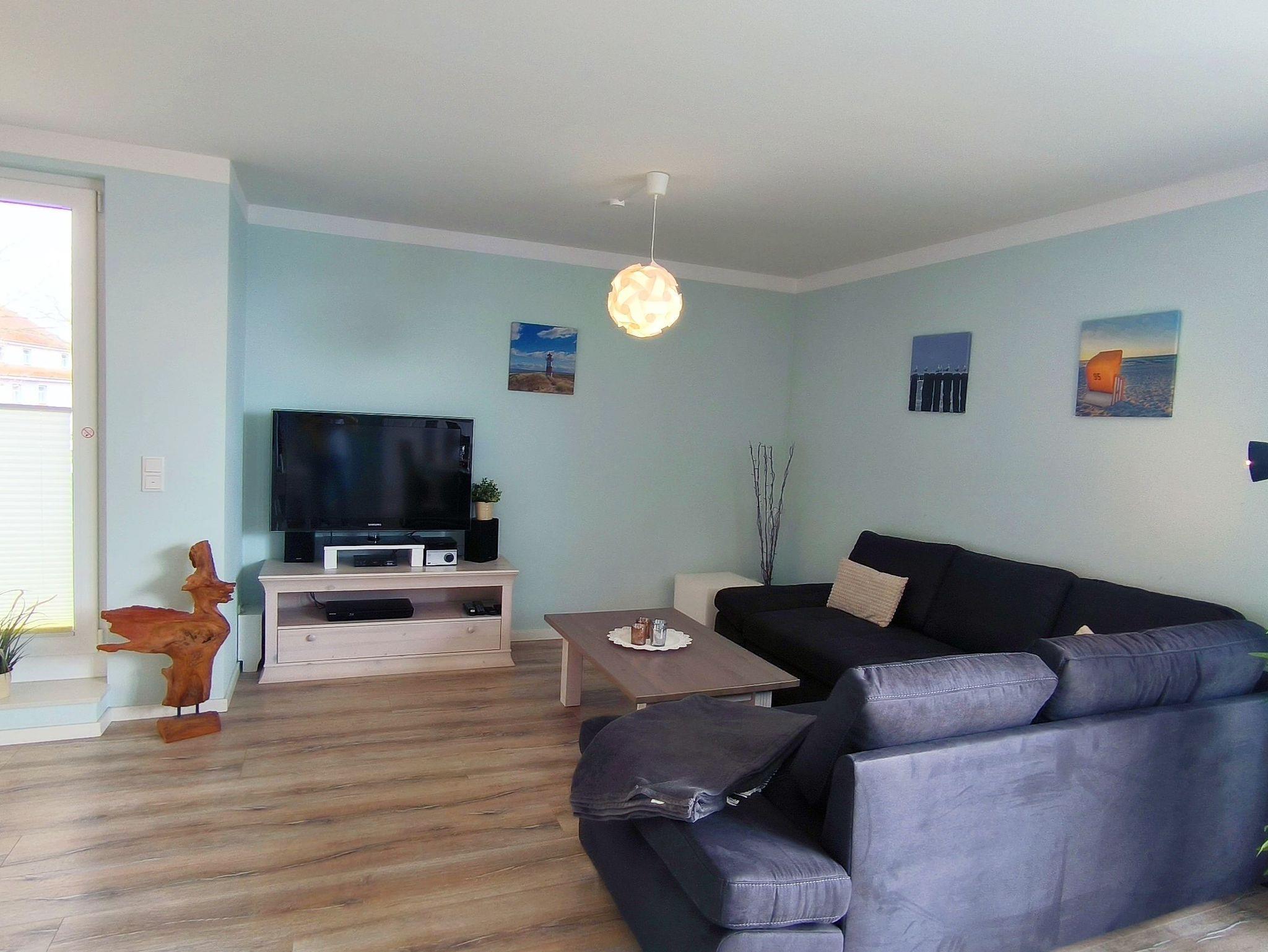 Unsere 93 qm große, gemütliche Ferienwohnung im maritimen Landhausstil mit exklusive Ausstattung , wie großem LCD Fernseher, WLAN, Blu-ray Player mit großer DVD-Sammlung für die regnerischen Tage uvm, befindet sich im Dachgeschoss eines Ende 2014 fertiggestelltem Ferienkomplexes mit Fahrstuhl und eigenem Auto Stellplatz direkt neben dem Gebäude. Die Wohnung verfügt über einen großzügigen Wohnbereich mit integrierter exklusiver Küchenzeile sowie einen komfortablen Essplatz. Insgesamt 3 Balkone laden zum Relaxen ein, wobei der Baklon mit kleinem Haffblick (Süden) über eine gemütliche Sitzecke und Essecke verfügt. Sie finden bei uns zwei helle, geräumige Schlafzimmer, die Platz für 2 bis maximal 6 Personen bieten. Ein Schlafzimmer verfügt über ein schönes, komfortables Doppelbett (Boxspringbett). Das andere über ein Etagenbett und ein Einzelbett mit integriertem Rollbett. Unser großzügiges Badezimmer verfügt über eine ebenerdige große Dusche und ein separates WC. Für die kleinen Gäste ist ein Kinderbett, Kinderstuhl und separates Kindergeschirr vorhanden