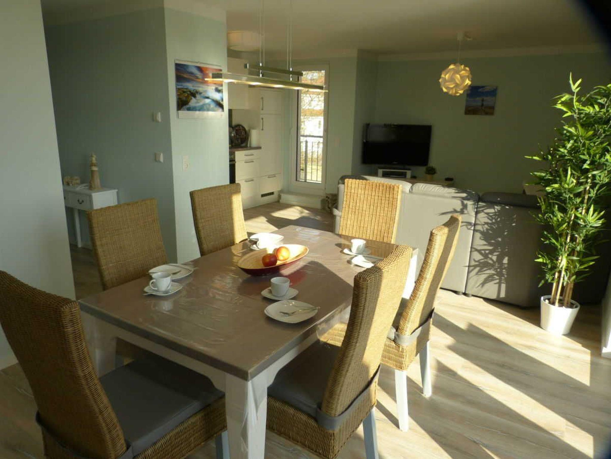 Unsere 93 qm große, gemütliche Ferienwohnung im maritimen Landhausstil mit exklusiver Ausstattung , wie großem LCD Fernseher, WLAN und Blu-ray Player , befindet sich im Dachgeschoss eines Ende 2014 fertiggestelltem Ferienkomplexes mit Fahrstuhl und eigenem Auto Stellplatz direkt neben dem Gebäude. Die Wohnung verfügt über einen großzügigen Wohnbereich mit integrierter exklusiver Küchenzeile sowie einen komfortablen Essplatz. Insgesamt 3 Balkone laden zum Relaxen ein, wobei der Balkon mit kleinem Haffblick (Süden) über eine gemütliche Sitzecke und Essecke verfügt. Sie finden bei uns zwei helle, geräumige Schlafzimmer, die Platz für 2 bis maximal 6 Personen bieten. Ein Schlafzimmer verfügt über ein schönes, komfortables Doppelbett (Boxspringbett). Das andere über ein Etagenbett und ein Einzelbett mit integriertem Rollbett. Unser großzügiges Badezimmer verfügt über eine ebenerdige große Dusche und ein separates WC. Für die kleinen Gäste ist ein Kinderbett, Kinderstuhl und separates Kindergeschirr vorhanden