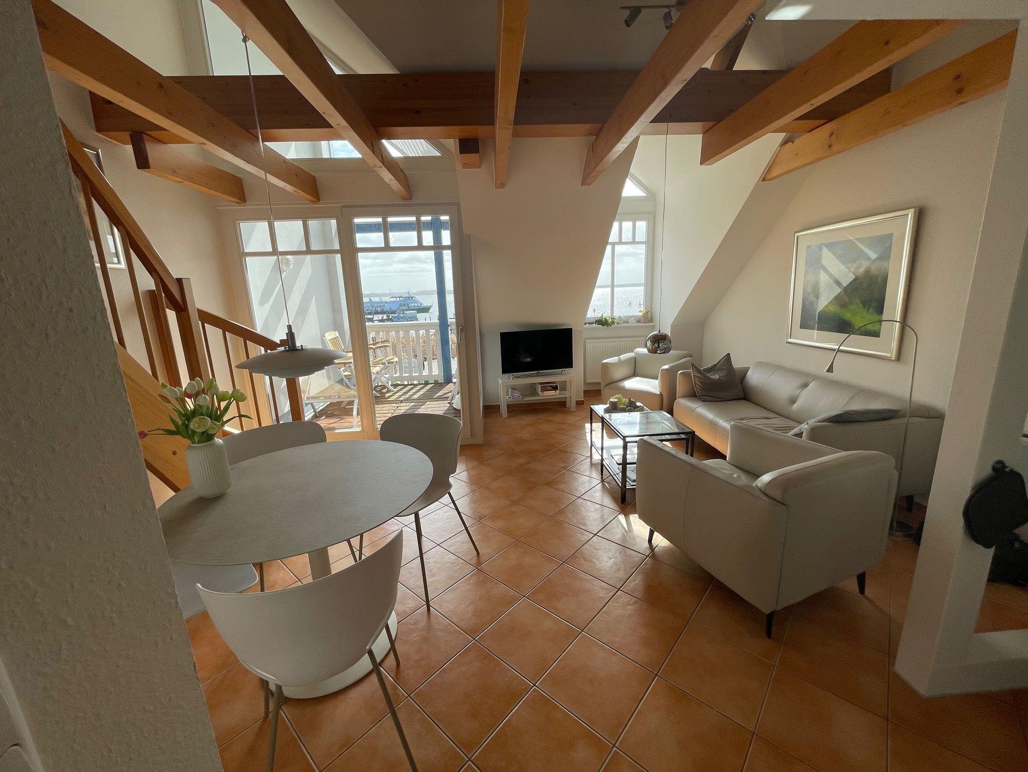 Großzügige Maisonnettewohnung mit offenen Wohn- Eßbereich und komplett ausgestatteter Küche. Herrliche Südloggia mit tollem Blick auf den Yachthafen und Salzhaff.
