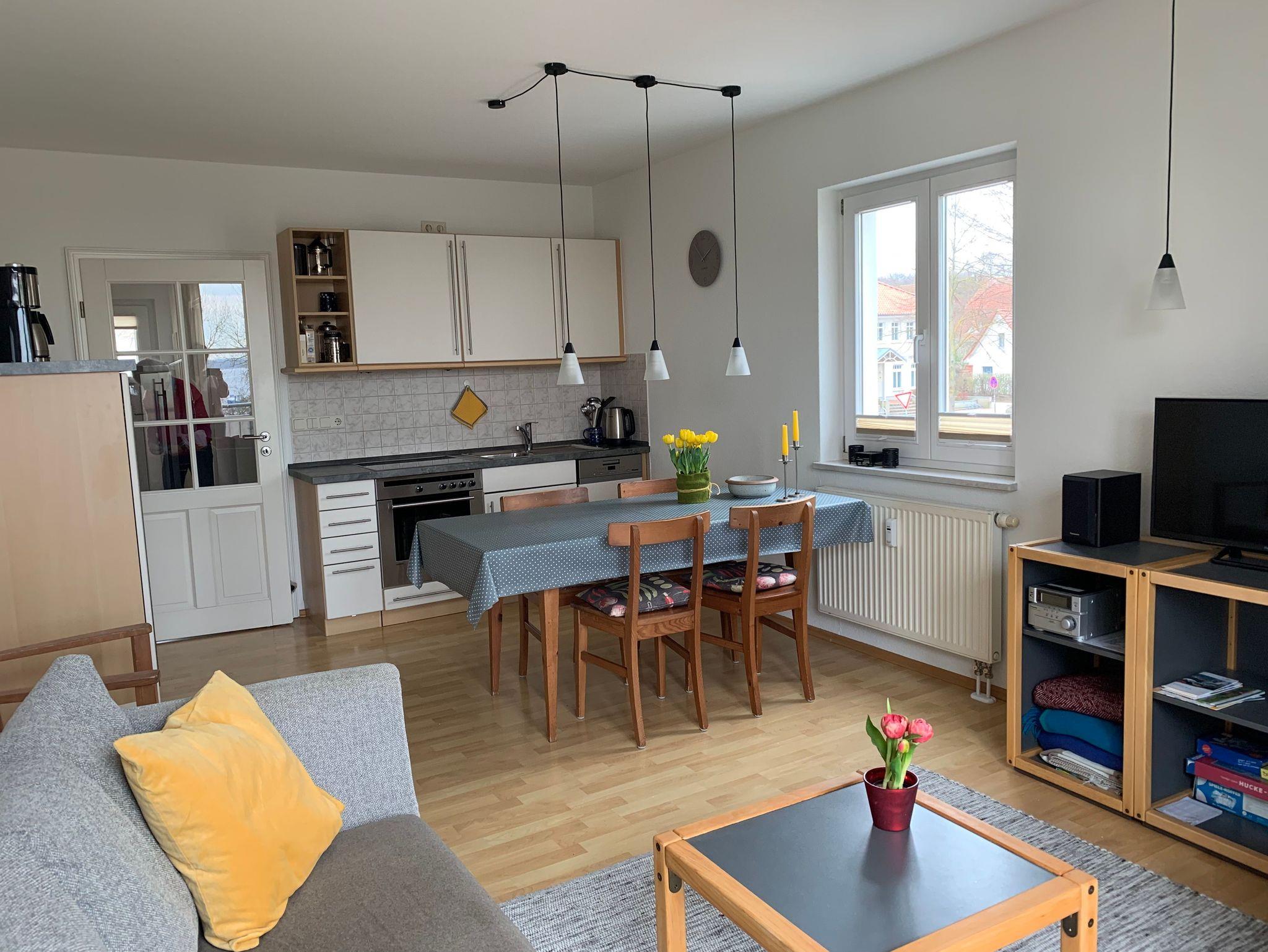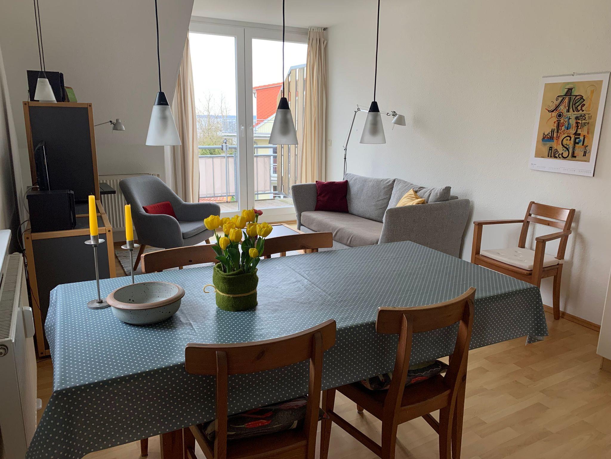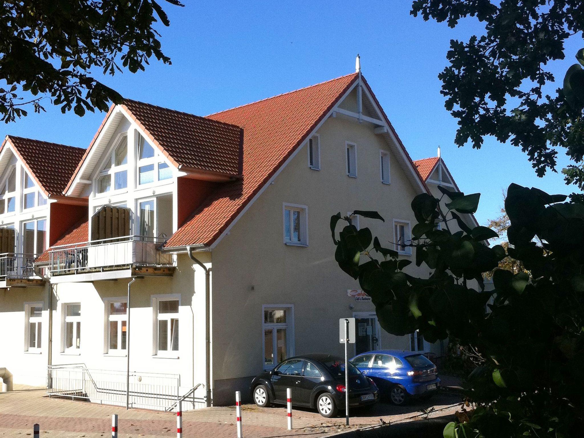 Schöne Lage mit Blick auf die alte Kirche und das Salzhaff. Ferienwohnung Nr. 20 in der 1. Etage des Kurhauses - Seitentrakt - Endlage. Die Wohnung besteht aus zwei Etagen. Im ersten OG befindet sich ein Wohn - Esszimmer mit Küchenzeile und daran anschließendem Balkon, sowie das Bad.