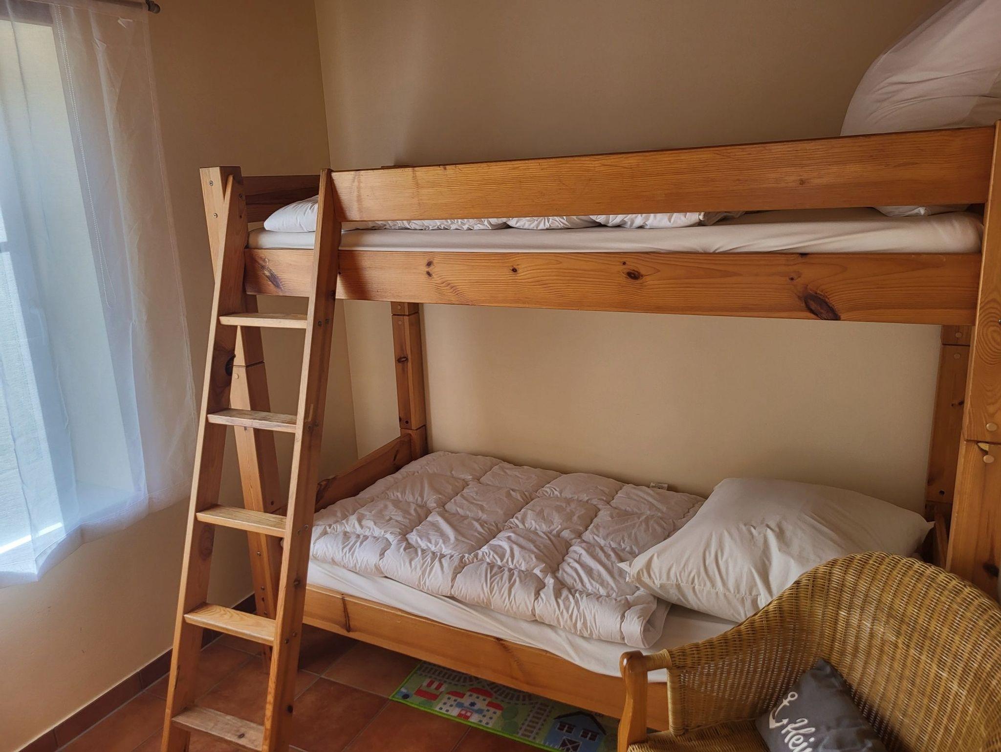 Im Obergeschoss unter den Dachschrägen befinden sich zwei weitere Schlafzimmer. Schlafzimmer 2 ist mit 2 Einzelbetten (je 0,90 m) ausgestattet, die wahlweise zusammen oder getrennt gestellt werden können. In Schlafzimmer 3 stehen 2 Einzelbetten (je 0,80 m) zur Verfügung. Zudem gibt es ein Gäste-WC mit Waschbecken.