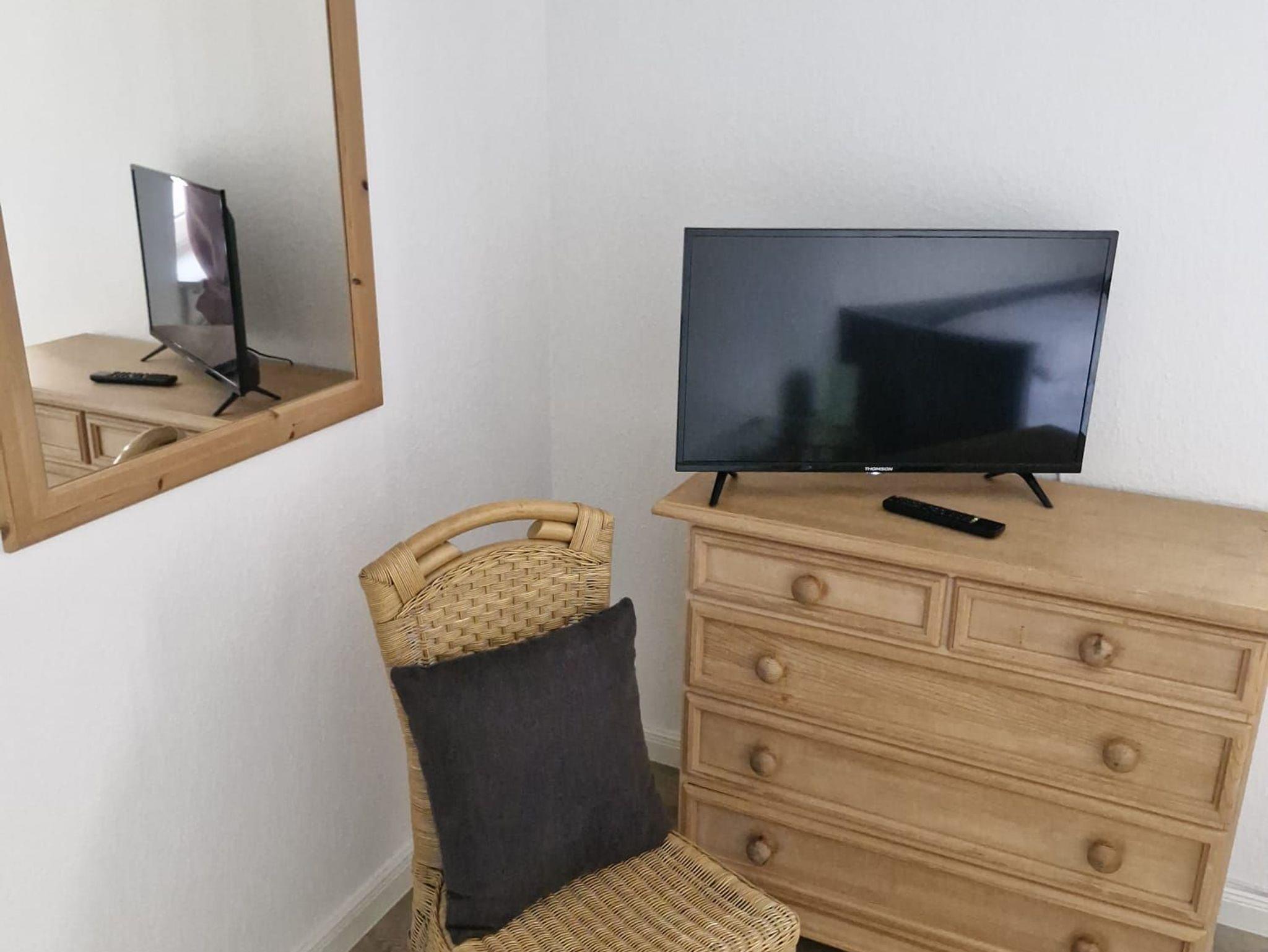 Im einem Schlafzimmer befindet sich ein Boxspringbett mit durchgehender Matratze und im zweiten Schlafzimmer zwei Einzelbetten und ein weiterer Flachbild-TV.