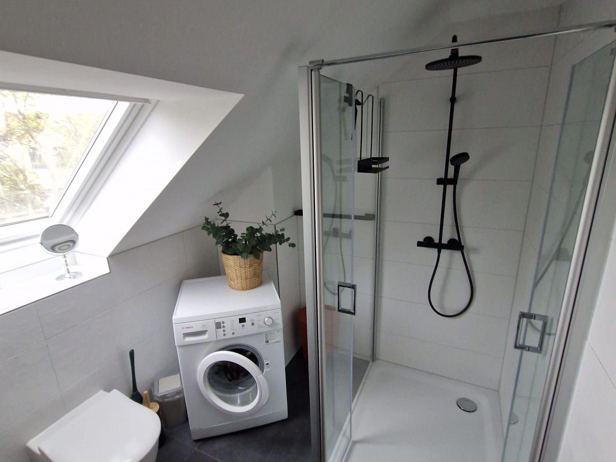 Dort finden sie auch das Badezimmer mit Dusche und WC sowie einer Waschmaschine.