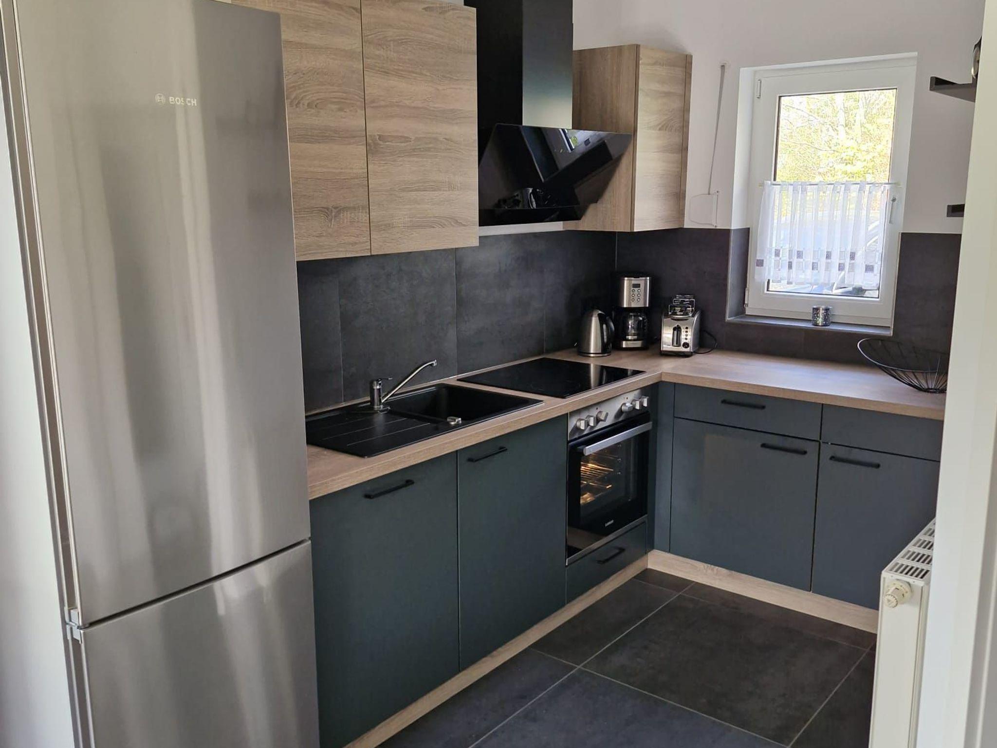 Daran angegliedert ist die komplett ausgestattete Küche mit großer Kühl- Gefrierkombination, Cerankochfeld mit Backofen, Geschirrspüler, Kaffeemasche, Wasserkocher, Toaster und vielem mehr.