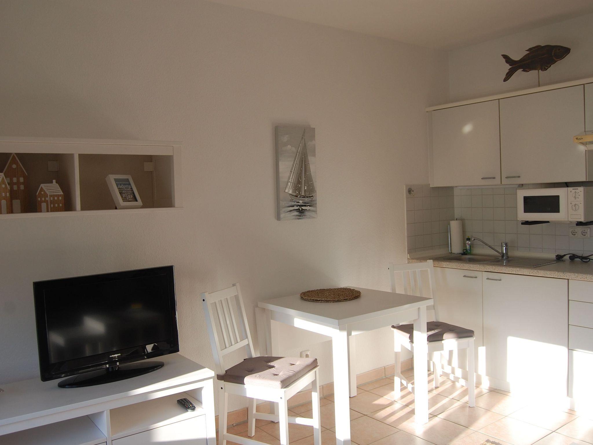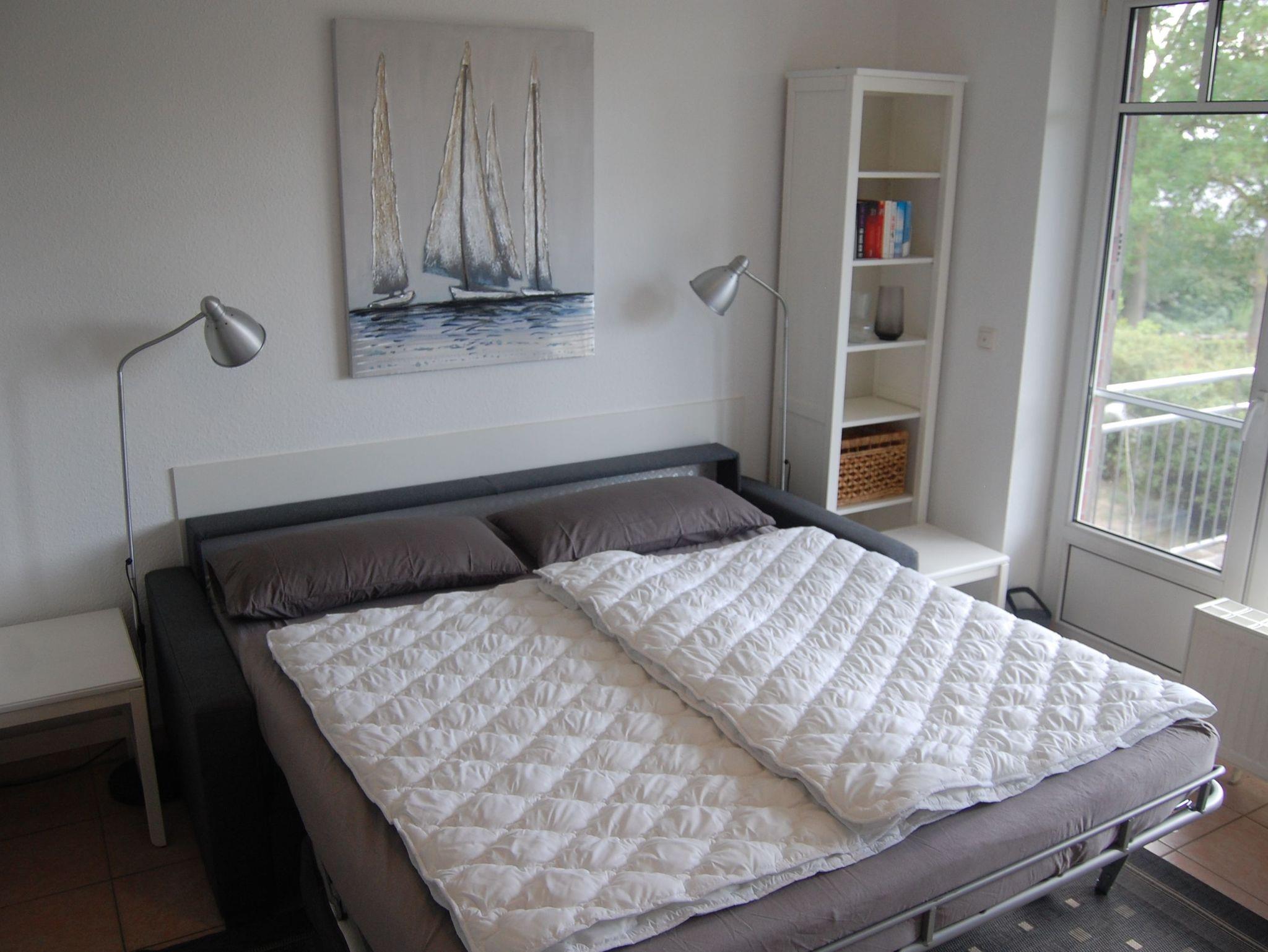 In erster Reihe zur Haffpromenade und nur 200 Meter vom Ostseestrand liegt unsere kleine, 24qm große, liebevoll und neu ausgestattete 1-Zimmer-Wohnung für 2 Personen. Sie verfügt über einen kombinierten Wohn-/ Schlafbereich mit hochwertiger Schlafcouch (170 X 200 cm) und Pantryküche, ein separates Duschbad und einen Balkon.