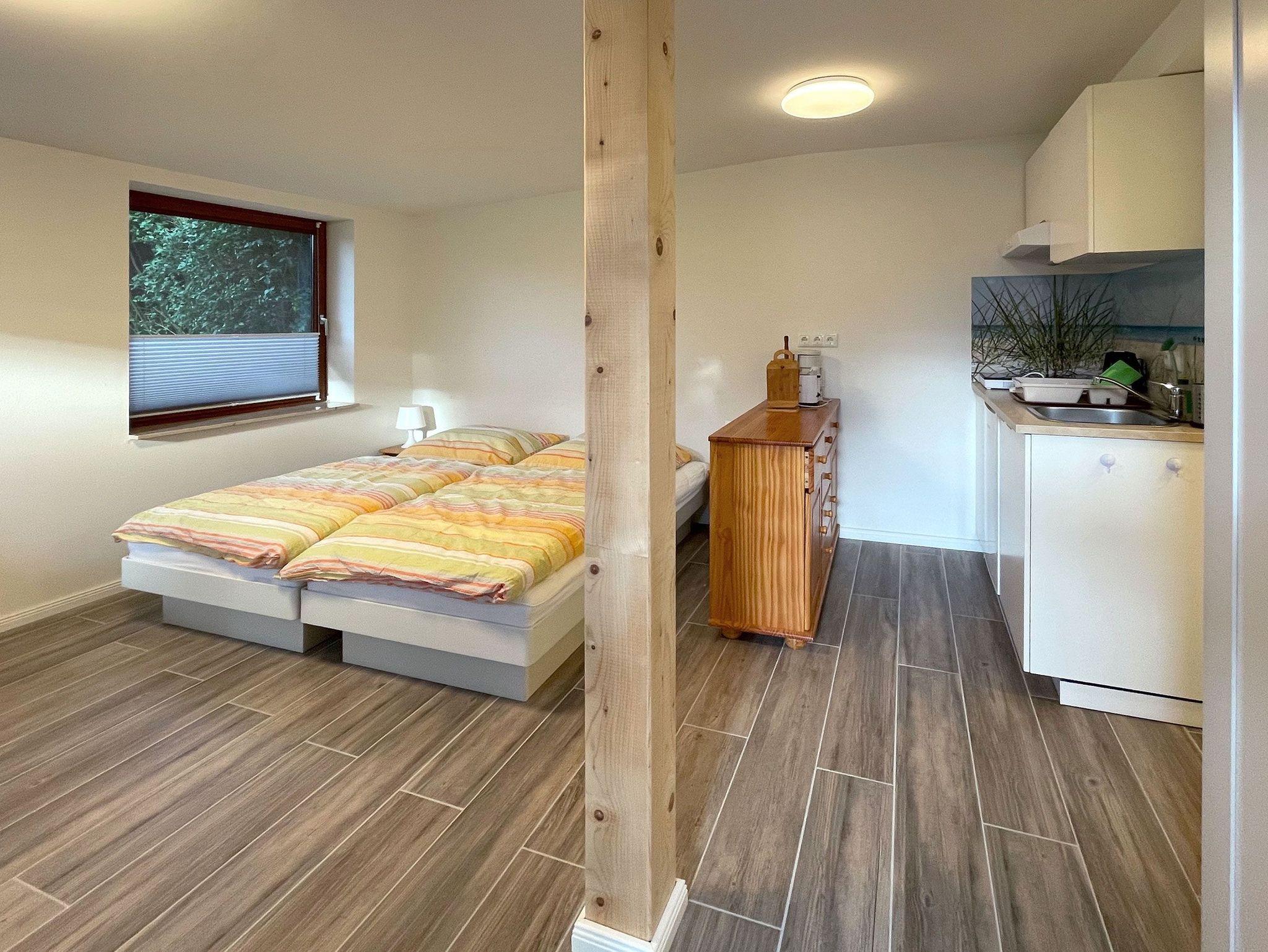 1 Zimmer mit Doppelbett, Wohn-/Essbereich, integrierter Küchenzeile, Doppelschlafcouch, Sessel, Esstisch, SAT-TV und Radio