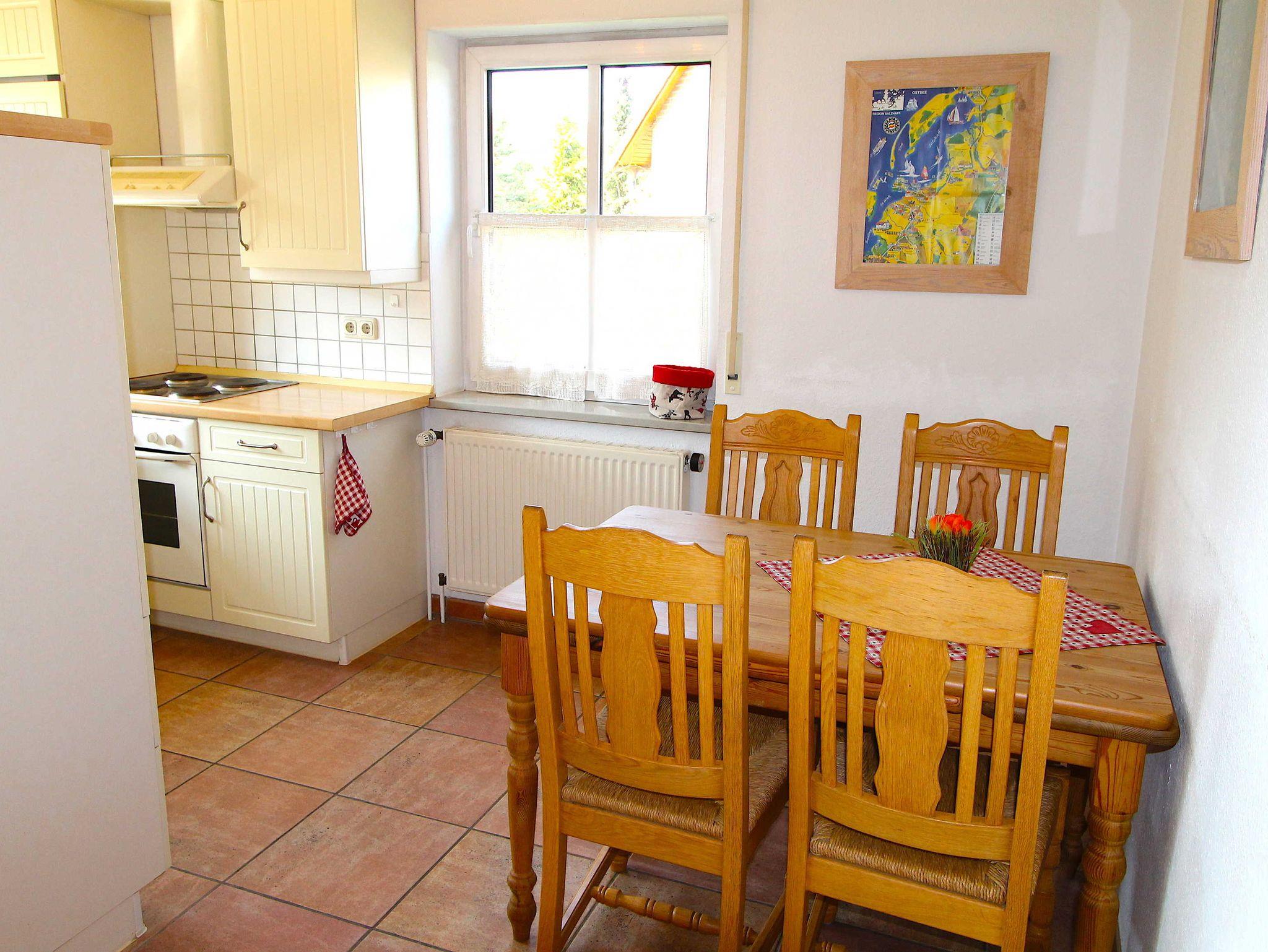 - Küche mit Essecke, Herd, Kühlschrank mit Gefrierfach, Geschirrspüler