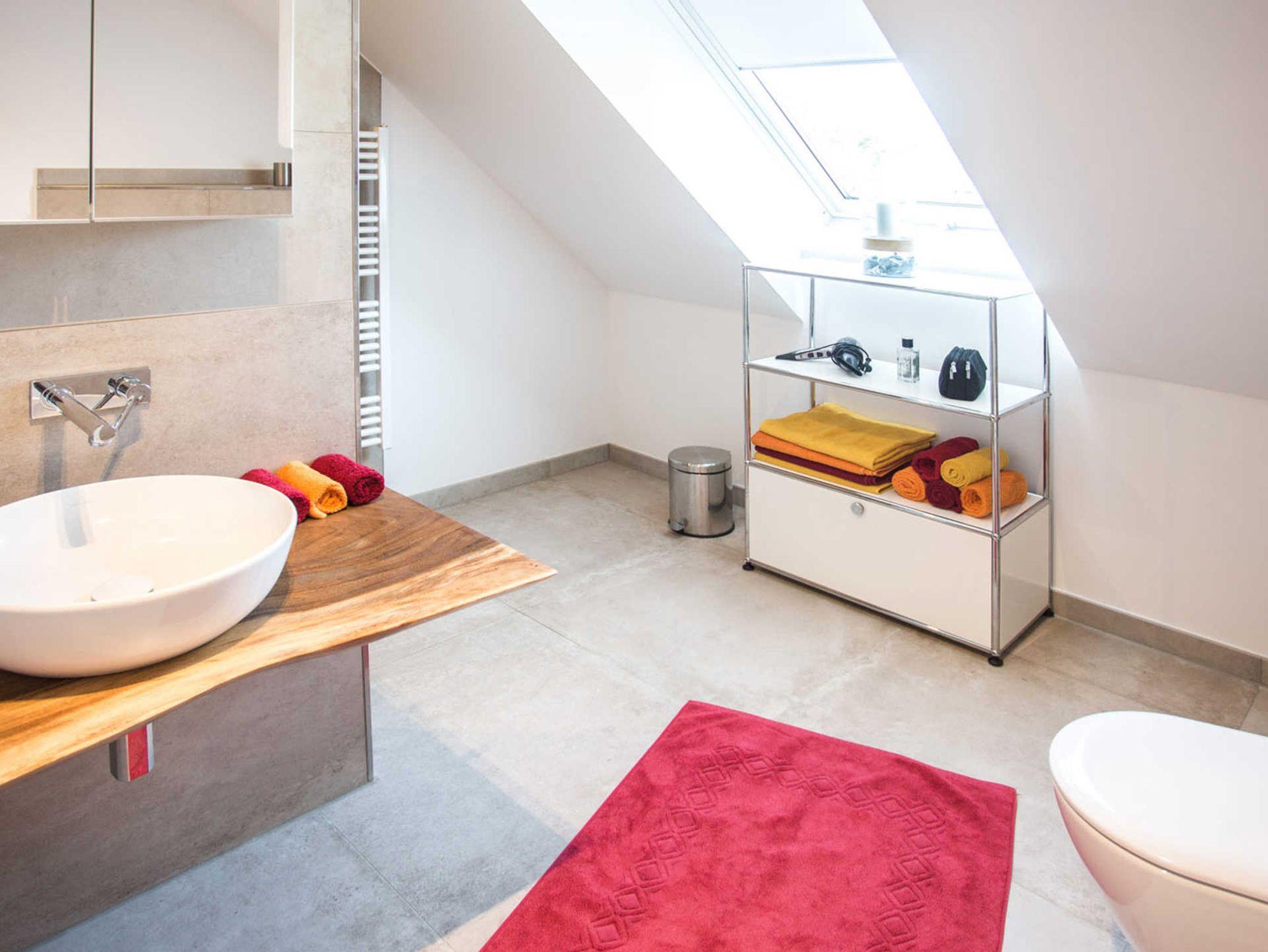 Das Badezimmer ist individuell mit einem Waschtisch auf einer großen massiven Baumscheibe eingerichtet. Die offene Dusche hat eine Sitzbank.