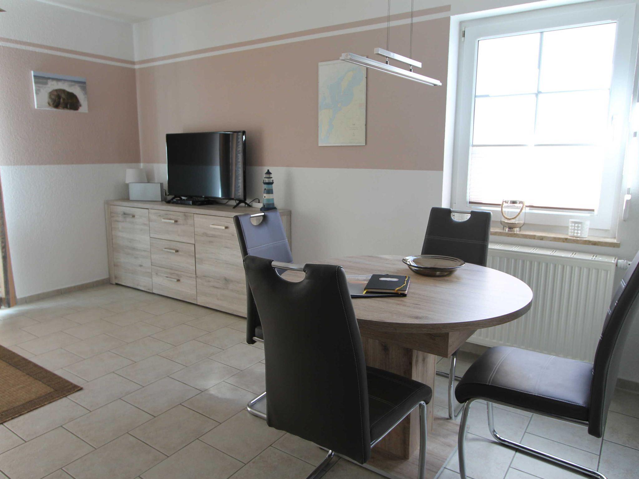 Im Erdgeschoss steht Ihnen ein modern eingerichteter Wohnraum zur Verfügung. Daran gliedert sich die überdachte Terrasse mit Gartenmöbeln.