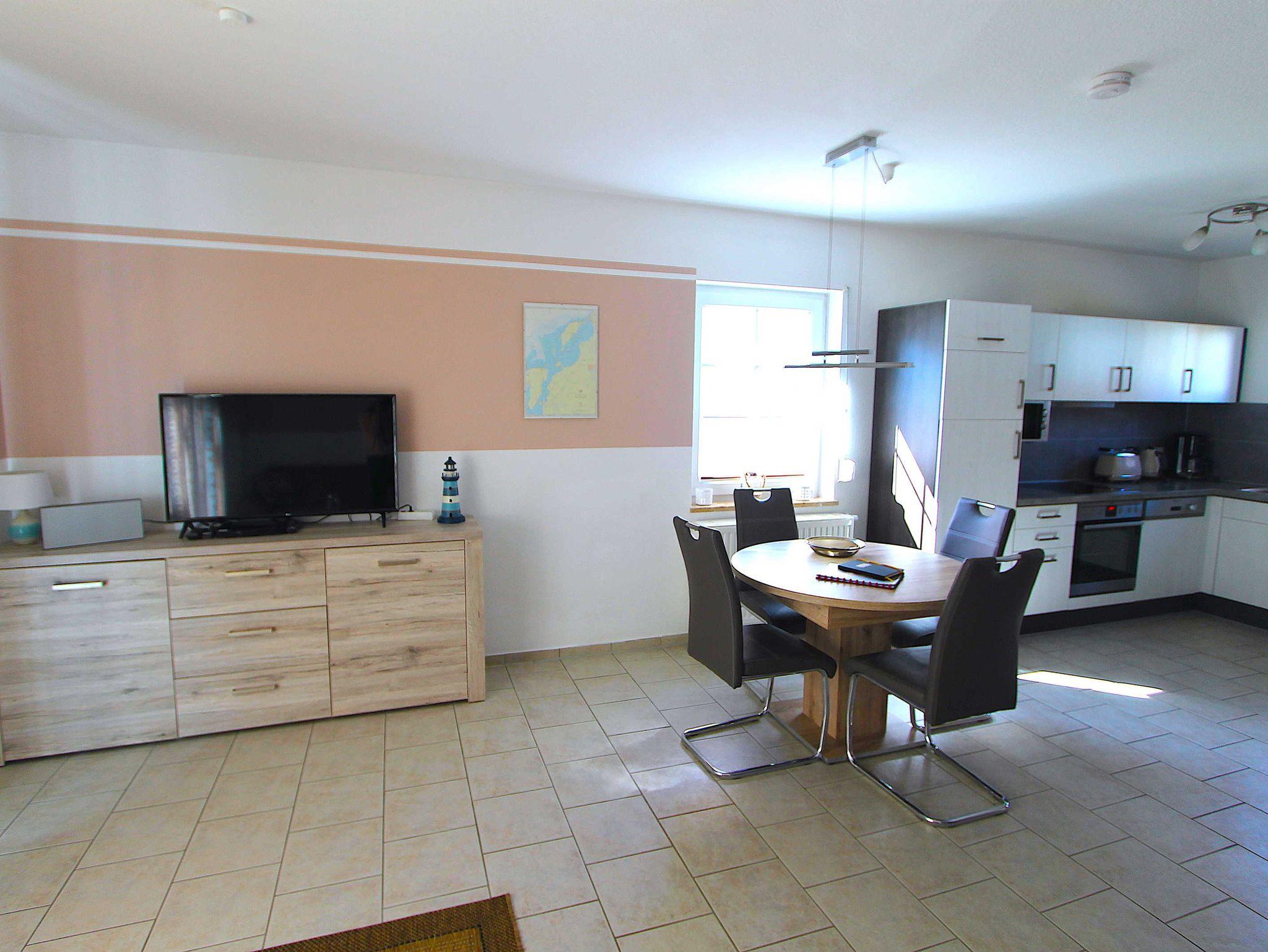 im Wohnraum integriert ist der Essbereich mit Tisch und Stühen sowie die komplett ausgestattete Küchenzeile mit Herd- Backofen, Kühlschrank und vielem mehr.