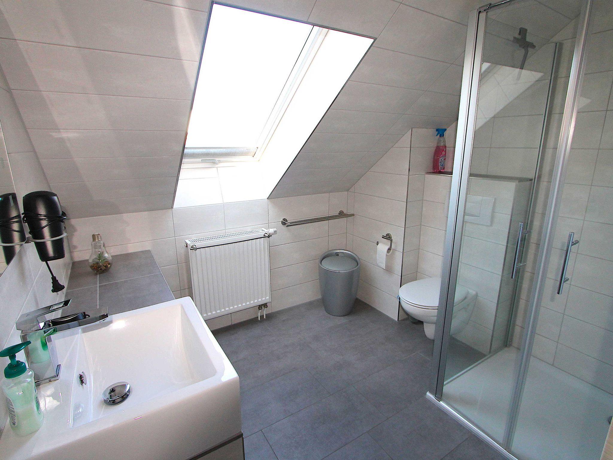 Ebenfalls im Obergeschoss befindet sich das Badezimmer mit Dusche und WC.