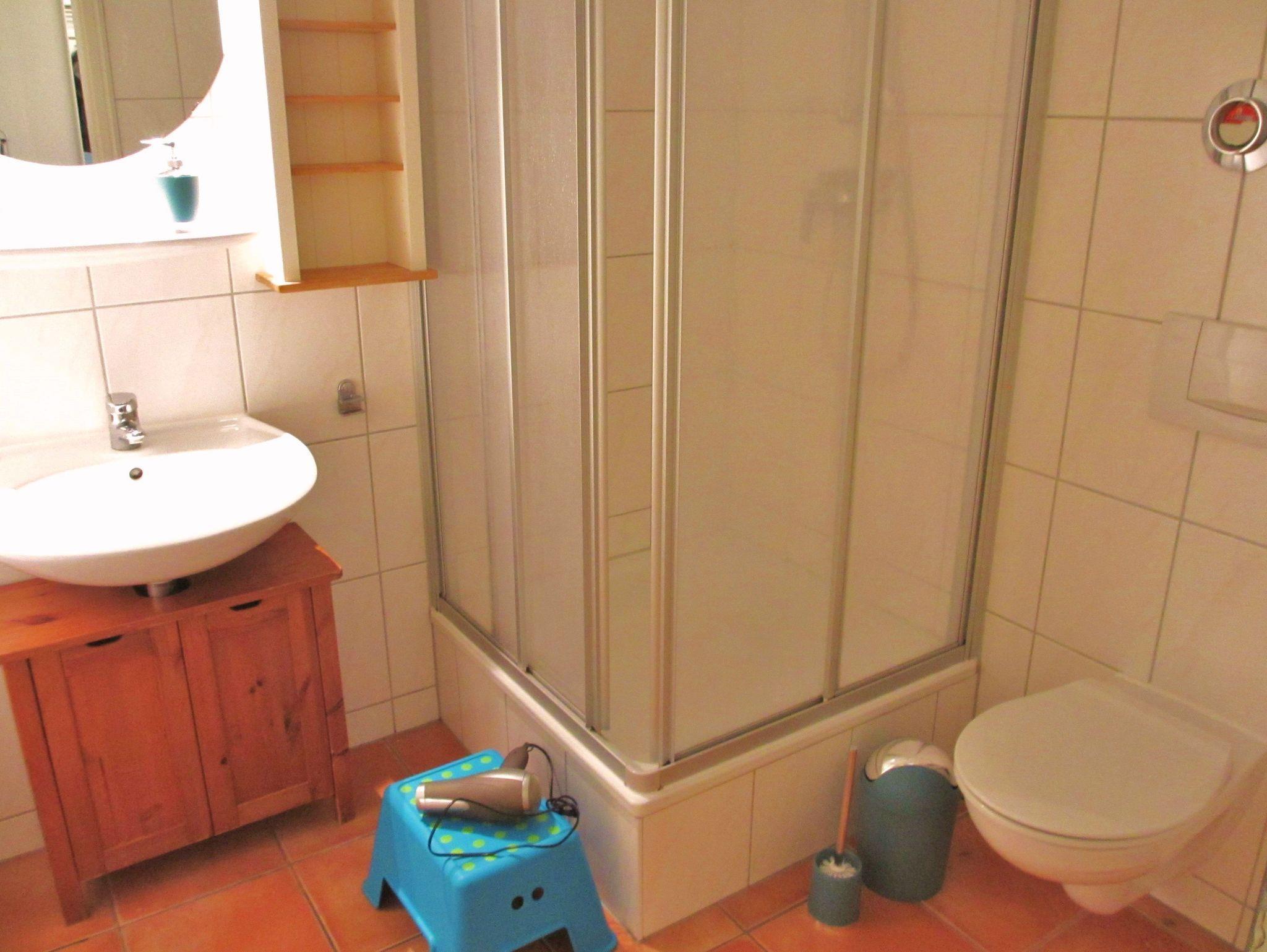 Neue moderne Küche und Esstisch mit 3 Stühlen und Sitzbank. Badezimmer mit Dusche und Föhn.