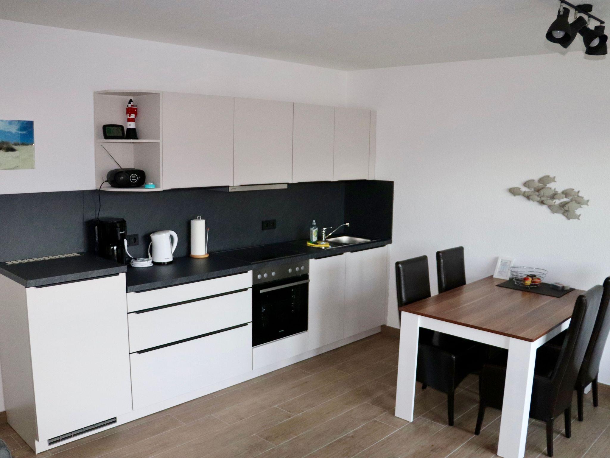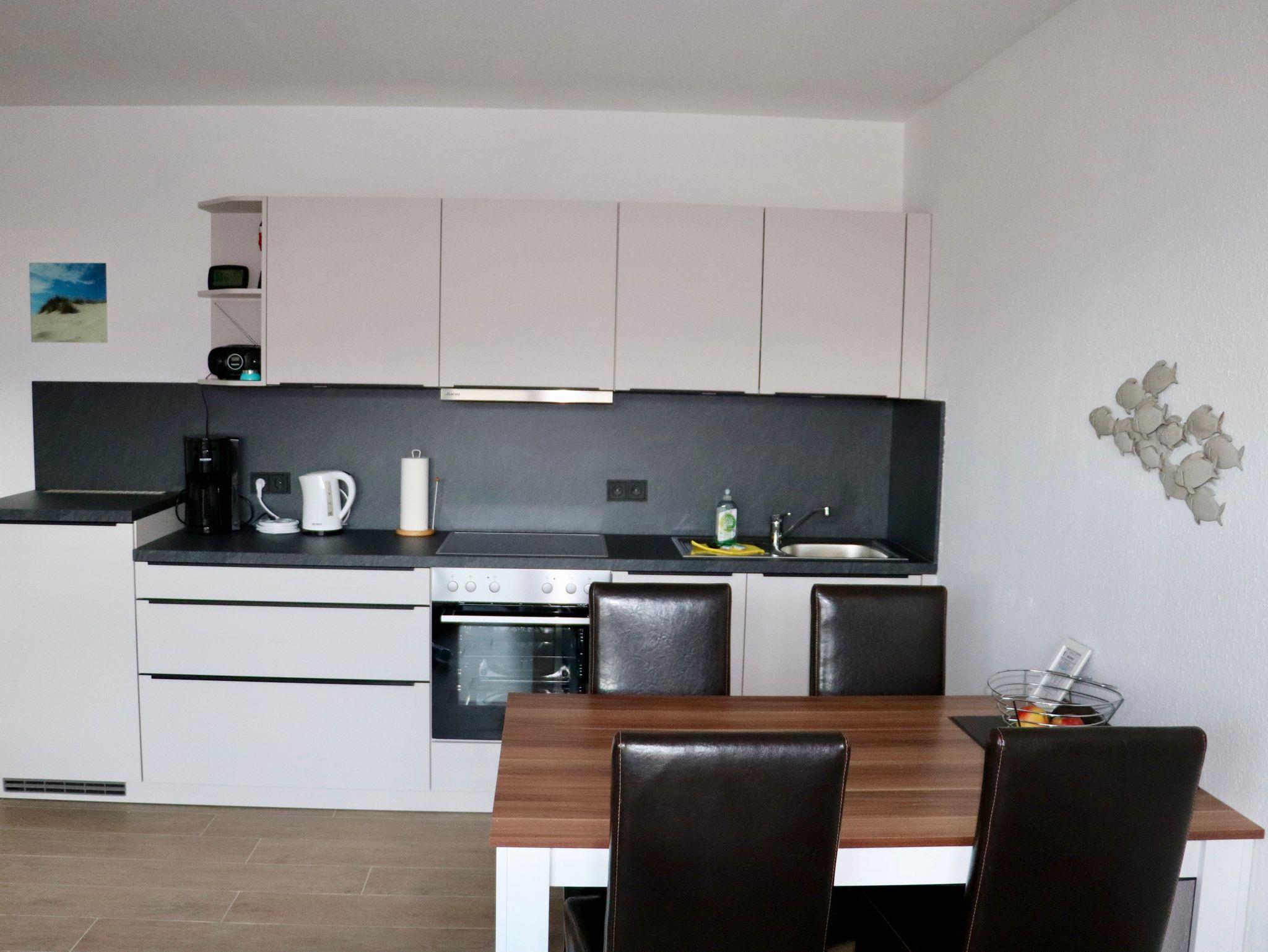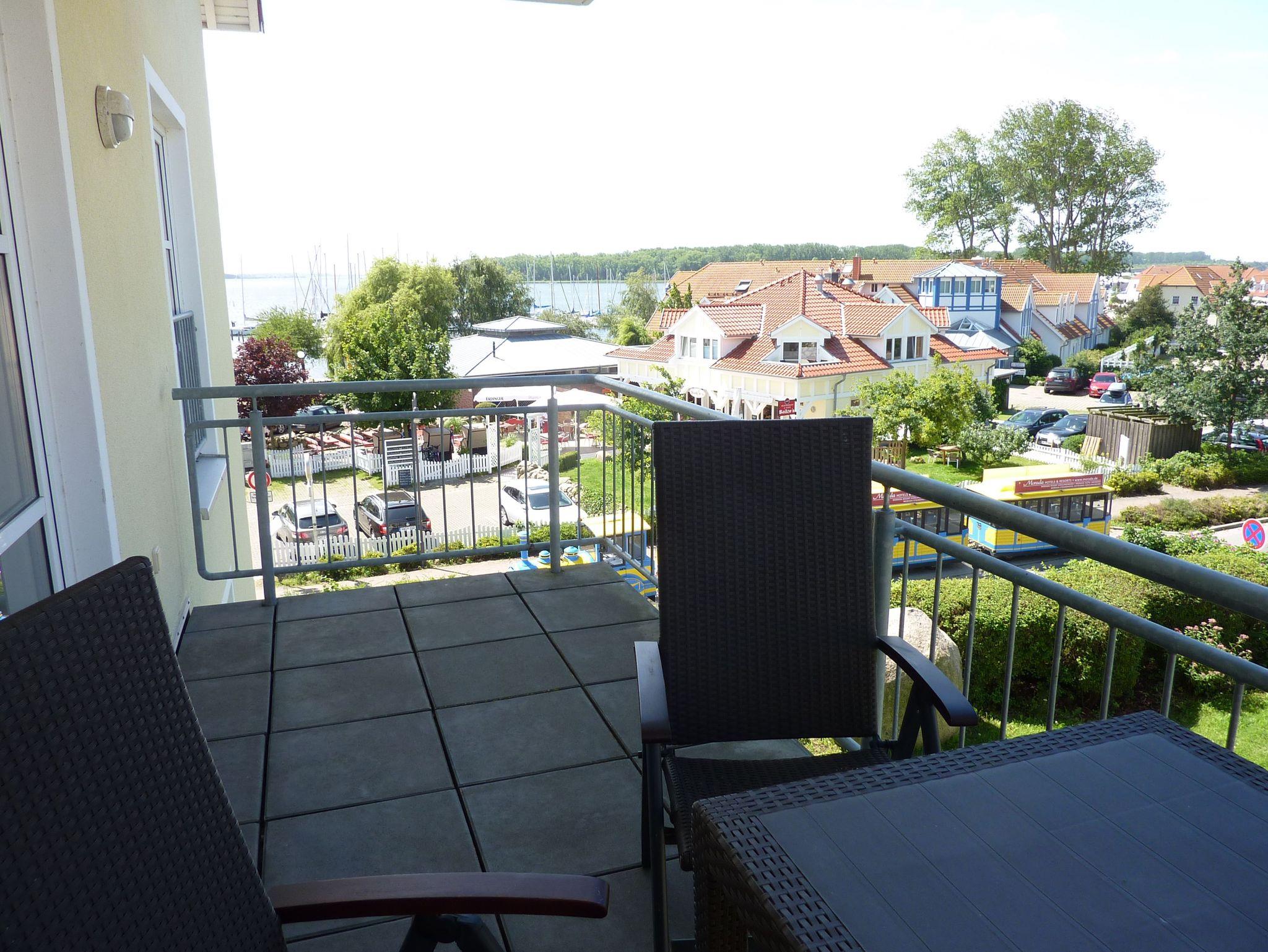 Die voll ausgestattete Küchenzeile, die mit einem Backofen und Geschirrspüler ausgestattet ist, ist harmonisch in das einladende Wohnzimmer integriert. Von diesem Raum aus gelangen Sie auf den großzügigen Balkon, der einen direkten Blick auf das Salzhaff und die Ostsee bietet. Die komfortablen Balkonmöbel sowie der Sonnenschirm laden dazu ein, die Nachmittags- und Abendsonne in vollen Zügen zu genießen.