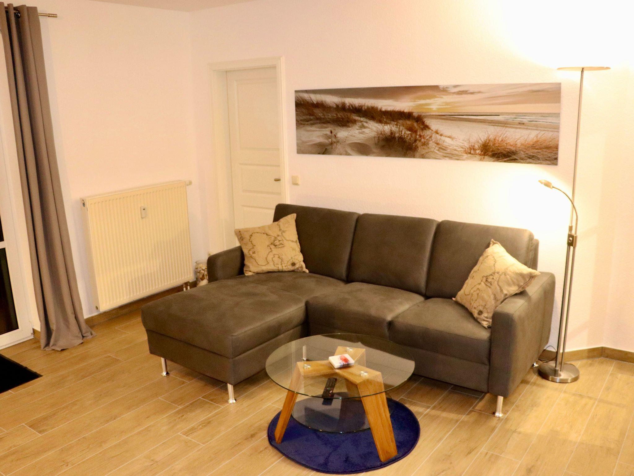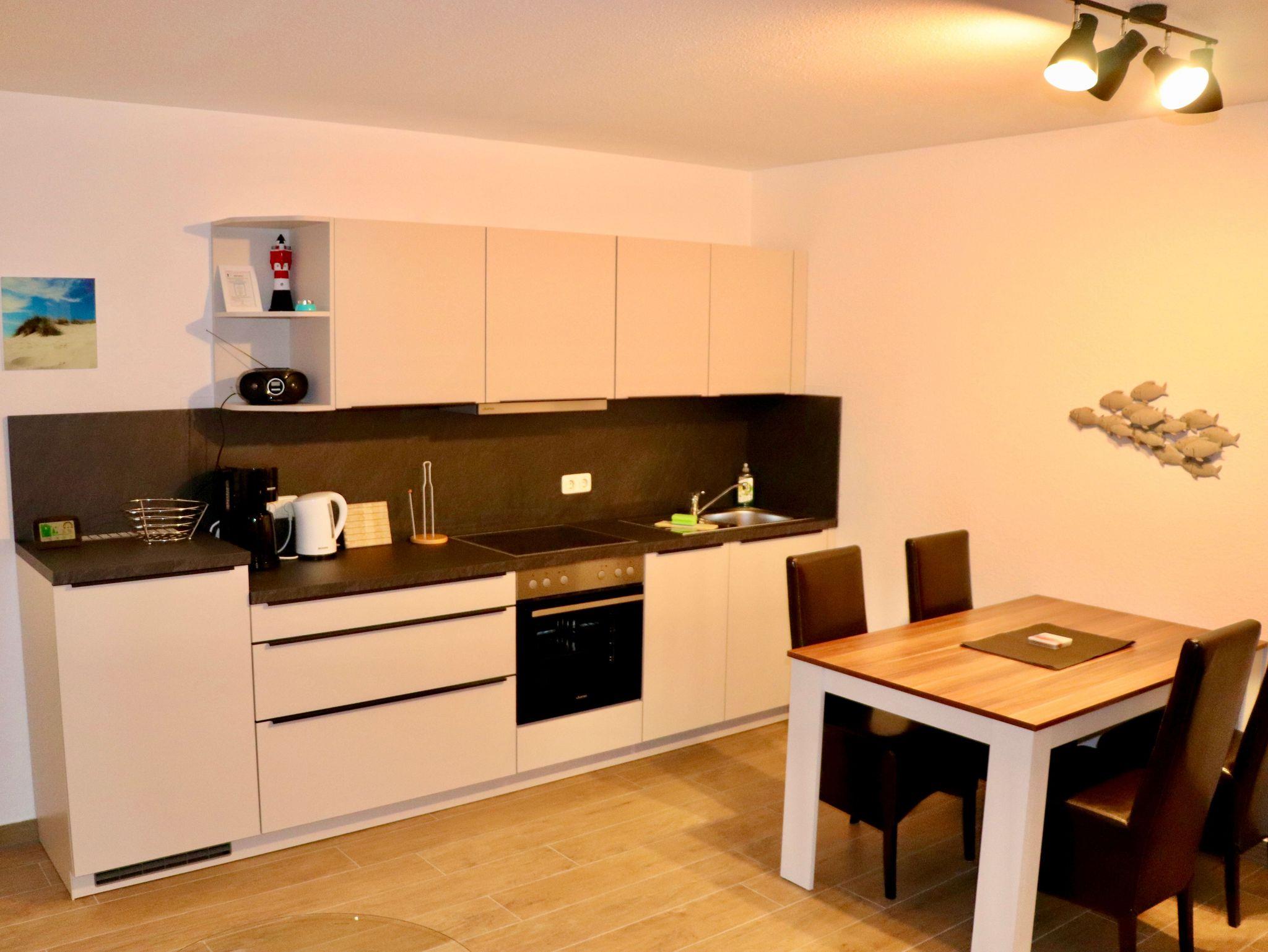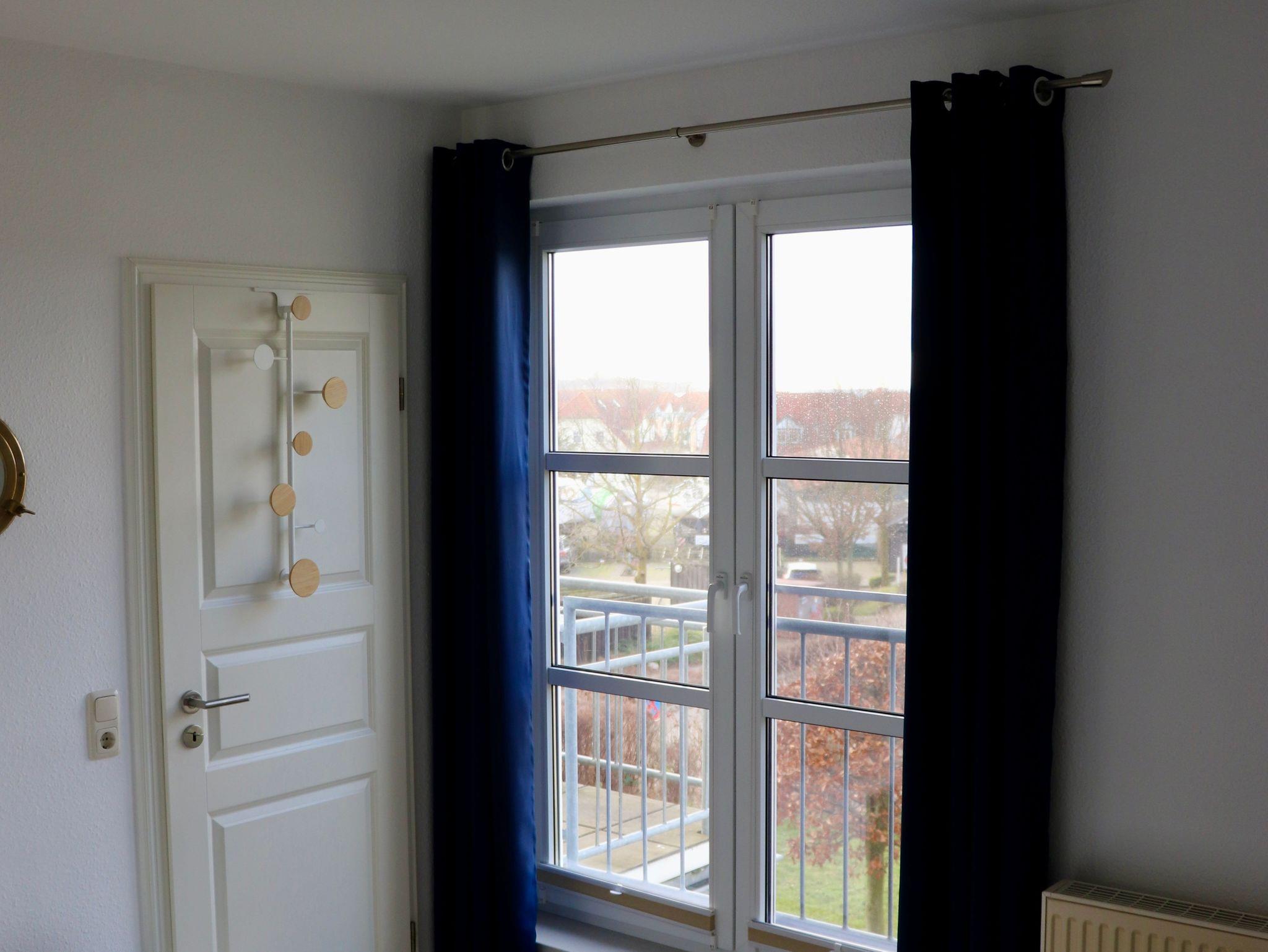 Die voll ausgestattete Küchenzeile, die mit einem Backofen und Geschirrspüler ausgestattet ist, ist harmonisch in das einladende Wohnzimmer integriert. Von diesem Raum aus gelangen Sie auf den großzügigen Balkon, der einen direkten Blick auf das Salzhaff und die Ostsee bietet. Die komfortablen Balkonmöbel sowie der Sonnenschirm laden dazu ein, die Nachmittags- und Abendsonne in vollen Zügen zu genießen.