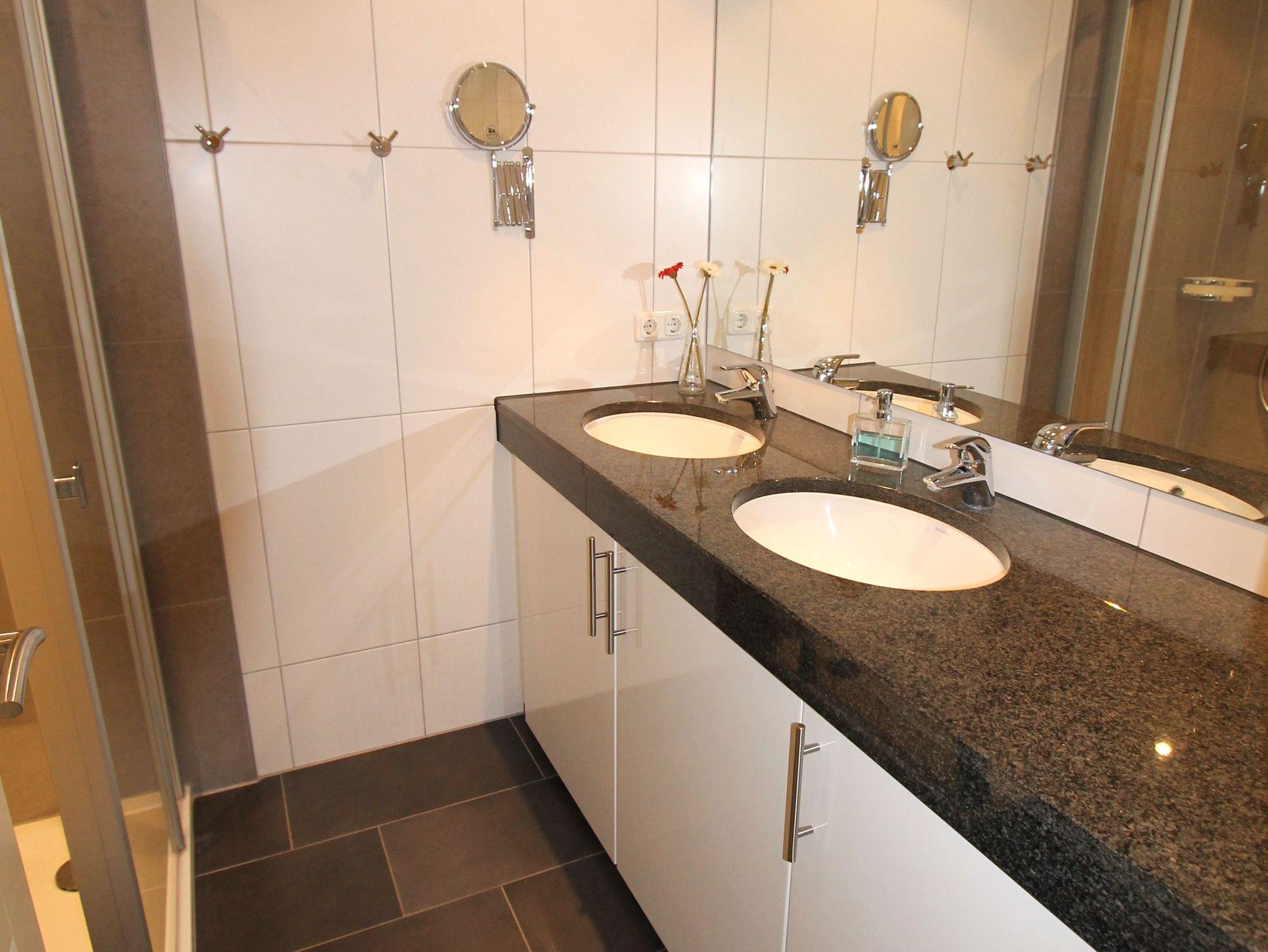 Das exlusive Badezimmer ist mit ebenerdiger Dusche, WC und Waschtisch ausgestattet.